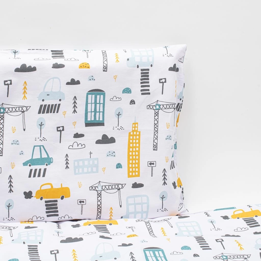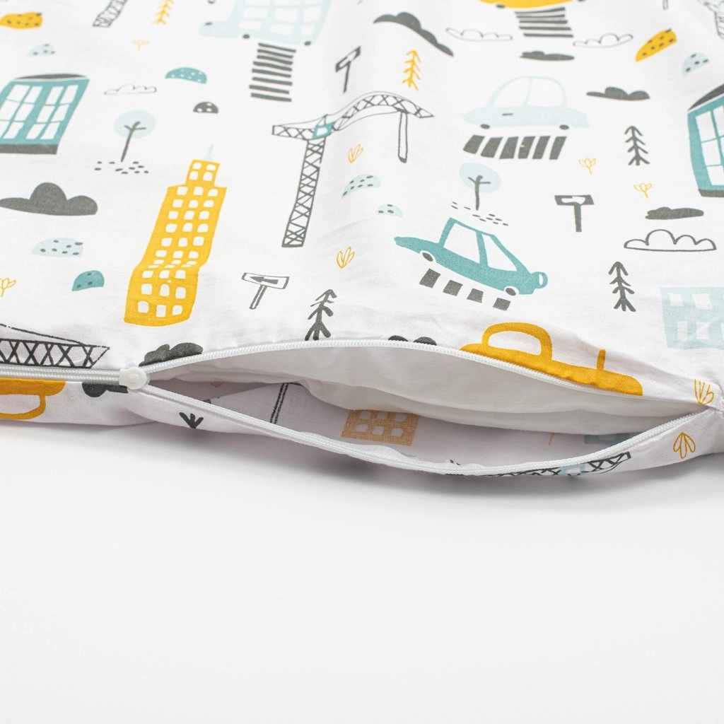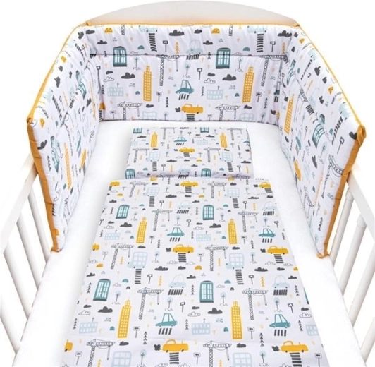Set confortabil și sigur de lenjerie din 3 piese pentru pătuțul copiilor NEW BABY, cu motiv urban în nuanță de muștar. Conține față de pernă 40×60 cm, husă pentru pilotă 120×90 cm și apărătoare (bumper) 31×175 cm. Fabricat din 100% bumbac pentru finețe, respirabilitate și pielea sensibilă a copiilor. Fermoare sigure fără capete atârnătoare și materiale antialergice asigură un somn liniștit și în siguranță.