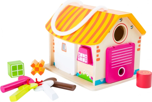 Această casă din lemn este excelentă pentru exersarea abilităților motorii ale copiilor. Fiecare cheie se potrivește la o altă ușă. Datorită elasticelor, acestea rămân deschise. Cărămizile au forme diferite, care trebuie introduse în deschiderea corectă. Pentru transportul căsuței servește un șnur. Principalele caracteristici: conține 9 piese, exersarea abilităților motorii, design colorat