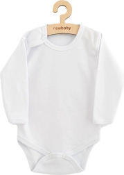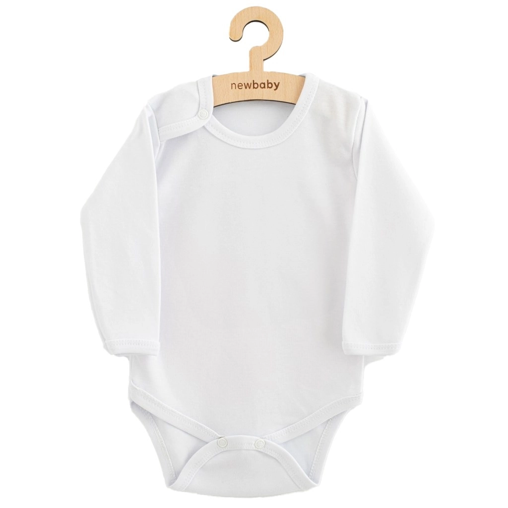 Body confortabil pentru bebeluși cu mânecă lungă de la marca New Baby, în culoare albă. Oferă material moale 100% bumbac, închidere practică cu capse pe umăr și între piciorușe și schimbare a scutecului și îmbrăcare ușoare pe tot parcursul zilei.