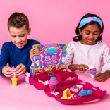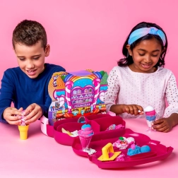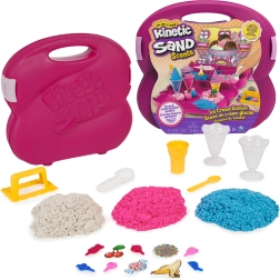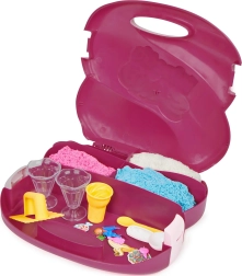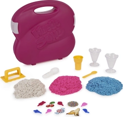 Setul Ice Cream Station într-o valiză portabilă solidă aduce 3 culori de nisip (în total 680 g) și o serie de unelte: cupe, linguri pentru înghețată, lingurițe și forme pentru deserturi realiste. Perfect pentru acasă și în călătorii – fiecare piesă are locul ei și după joacă totul se strânge ușor.