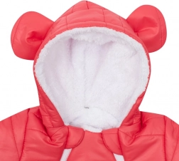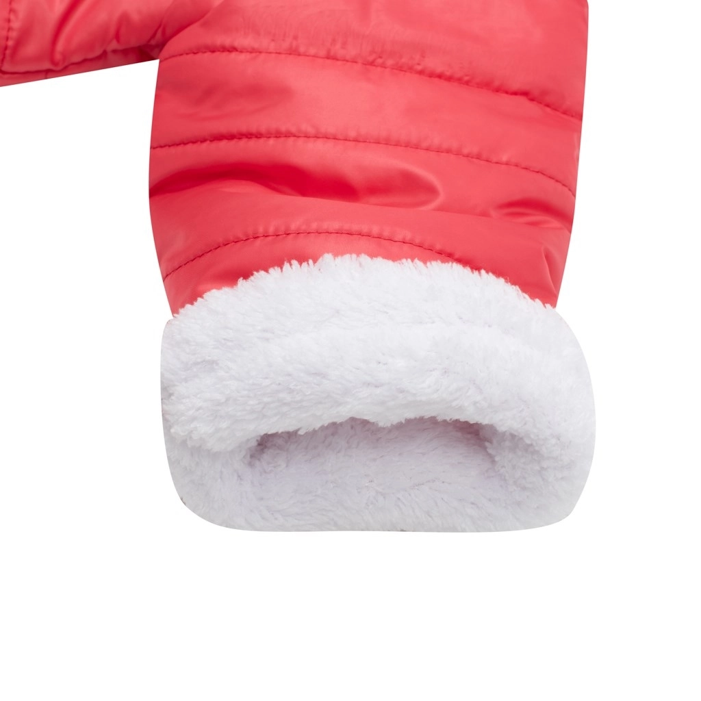 Gluga cu urechiușe adaugă un aspect adorabil, iar umplutura anti-alergică din poliester sporește căldura și confortul. Mânecuțele pot fi răsfrânte pentru a evidenția căptușeala foarte moale din fleece și pentru a proteja și mai bine mânuțele de frig. Combinezonul este ideal pentru cărucior și scaun auto.