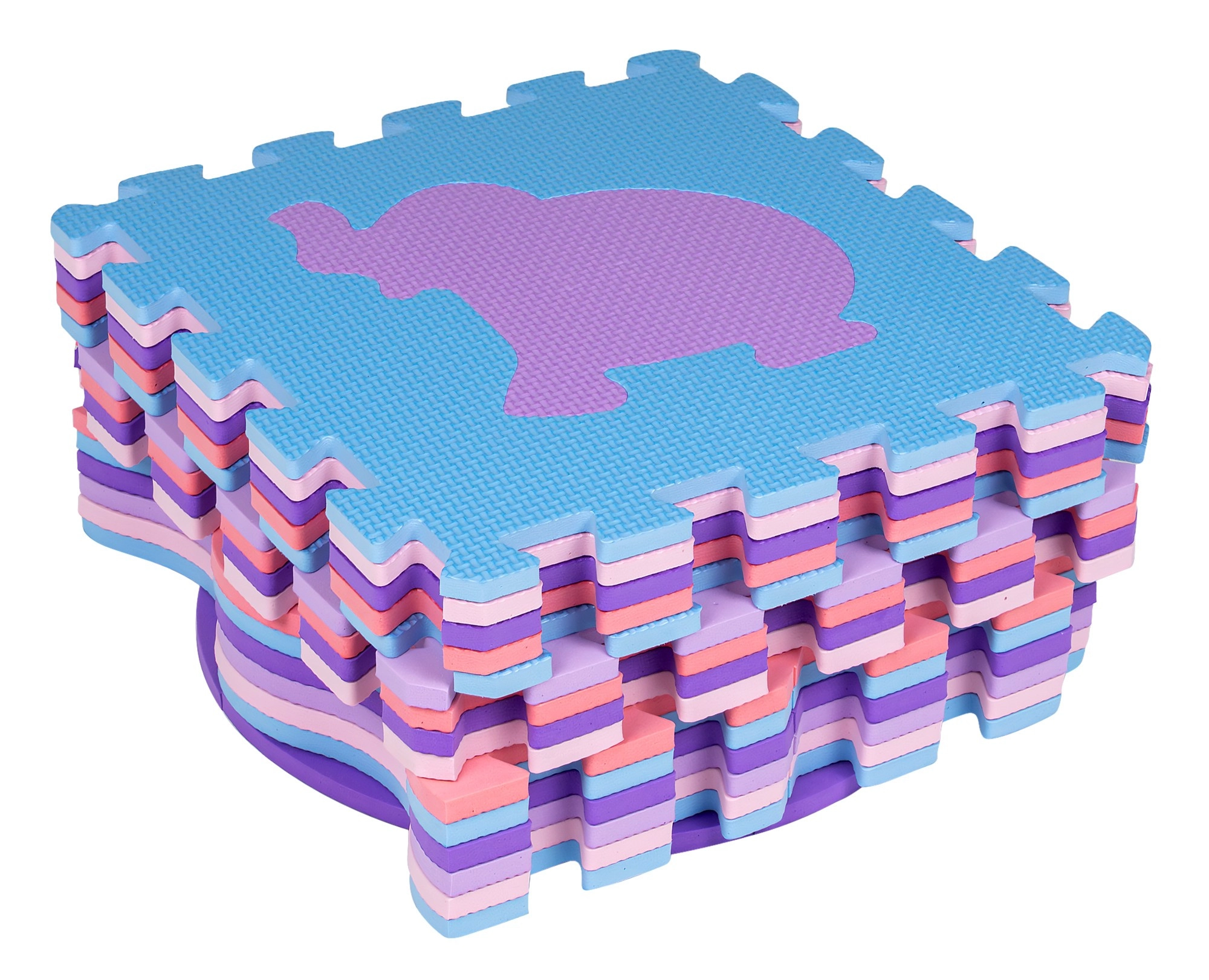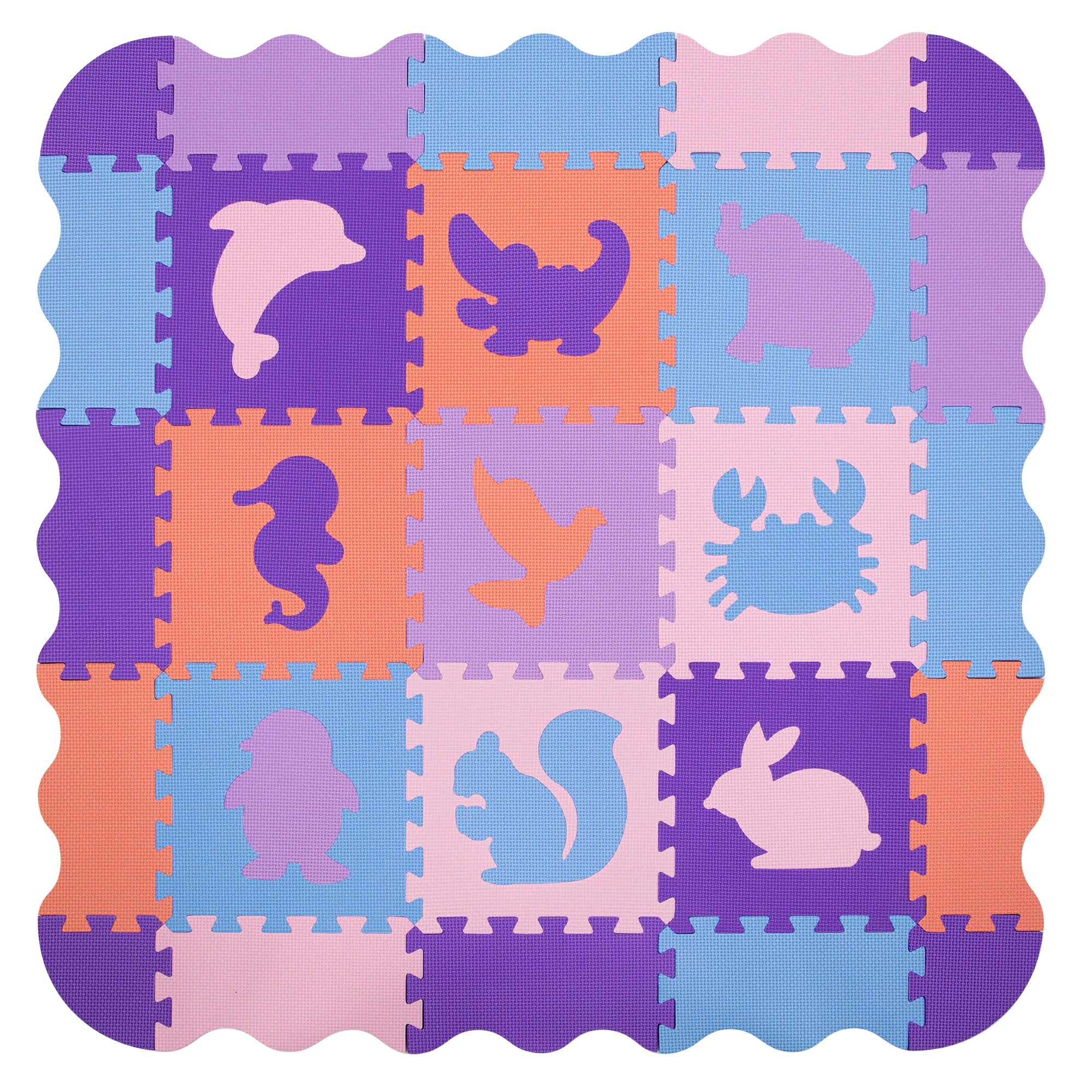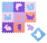 Materialul sigur EVA este elastic, amortizează loviturile și izolează foarte bine frigul de la podea. Suprafața texturată este antiderapantă pentru primele târâri și pași. Fiecare piesă are un motiv de animal detașabil (pinguin, delfin, veveriță, crab, porumbel, crocodil, iepure, căluț de mare, elefant), astfel copiii exersează motricitatea fină și logica.