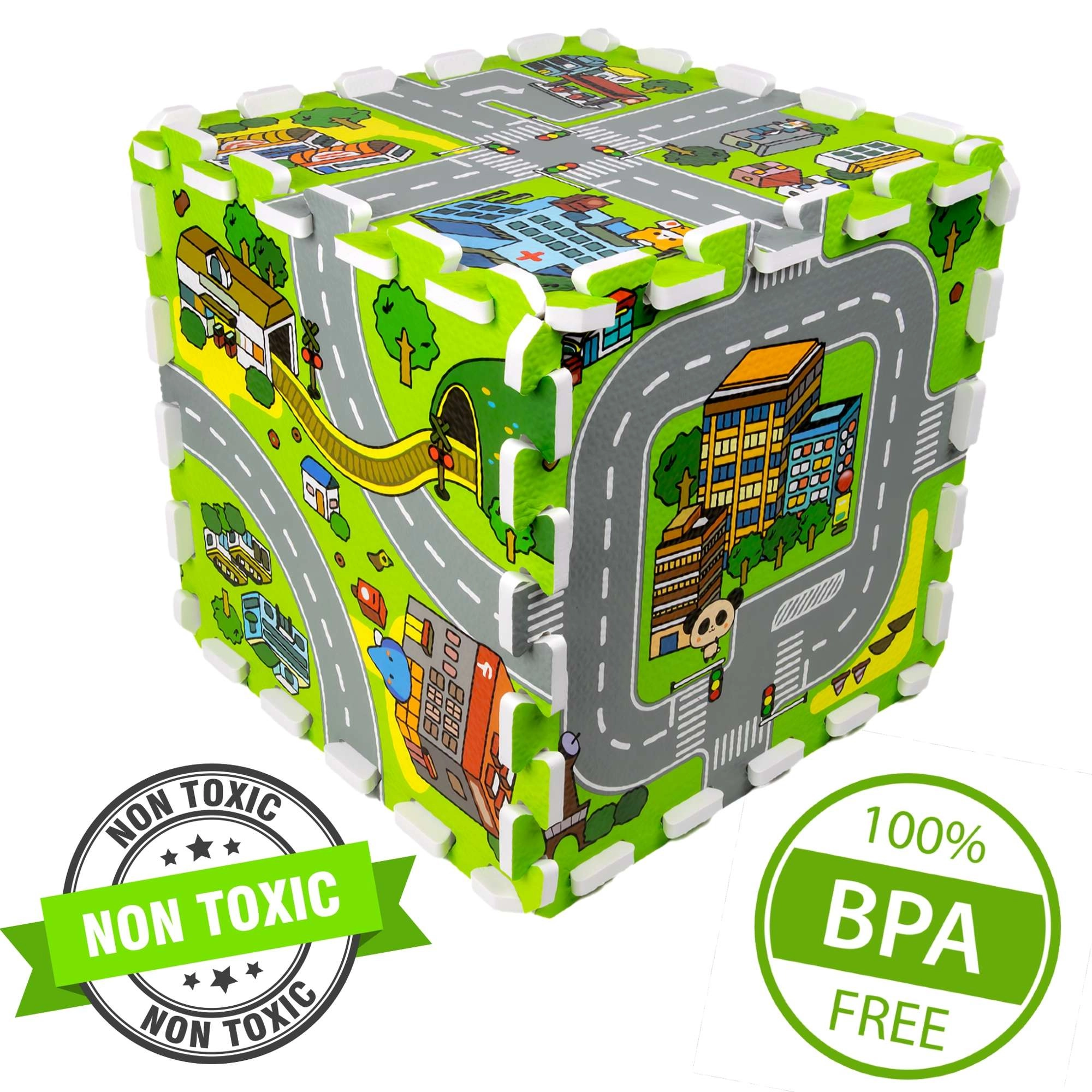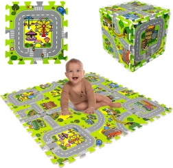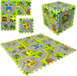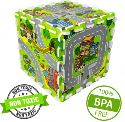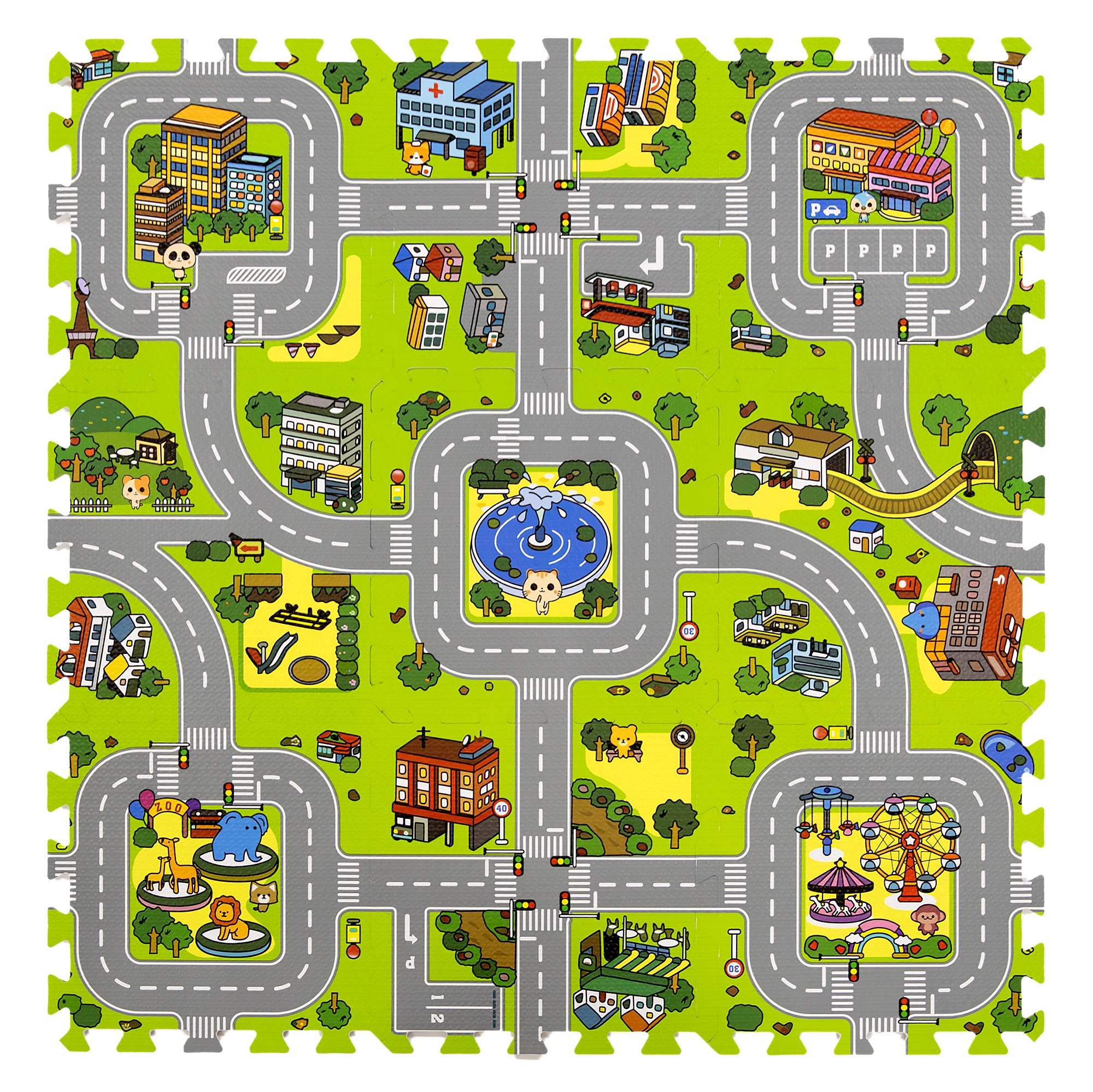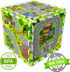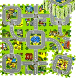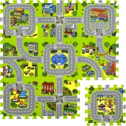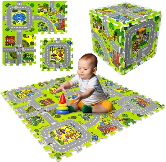 Acest covoraș din spumă pentru copii, de calitate, cu motiv de oraș, creează o suprafață moale și sigură pentru bebeluși și copiii mai mari. Fiecare piesă prezintă o altă parte a orășelului – drumuri, parc, zoo, spital, stație de alimentare și altele – fiind ideal ca scenă de joacă pentru mașinuțe și figurine. Datorită grosimii de 1 cm, covorașul amortizează căderile, protejează de frig și este ușor de întreținut.