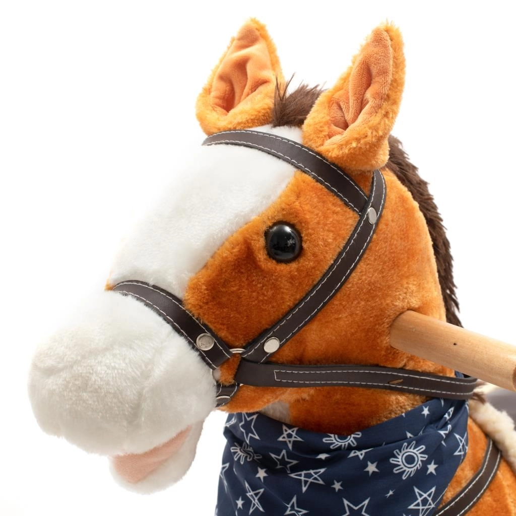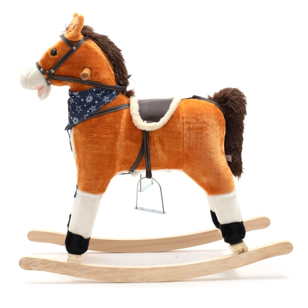 Drăgălașul cal de legănat BABY MIX Zeus oferă copiilor de la 12 luni ore de distracție sigură și imaginație. La apăsarea urechilor pornesc sunete de trap sau melodii, calul își mișcă coada și deschide gurița. Șinile din lemn stabile, scărițele metalice, frâul rezistent și șaua confortabilă din piele ecologică asigură o poziție sigură, iar plușul moale îmbie la mângâiat.