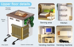 Peretele lateral rabatabil dezvăluie încăperi atent echipate – de la tejghea și automatul de băuturi până la scară și un dormitor primitor cu computer, pat, șifonier și aer condiționat. Detalii exterioare precum stâlp electric, canal de aerisire, ferestre, jgheab, aer condiționat, firmă și meniu subliniază caracterul de colecție al modelului.