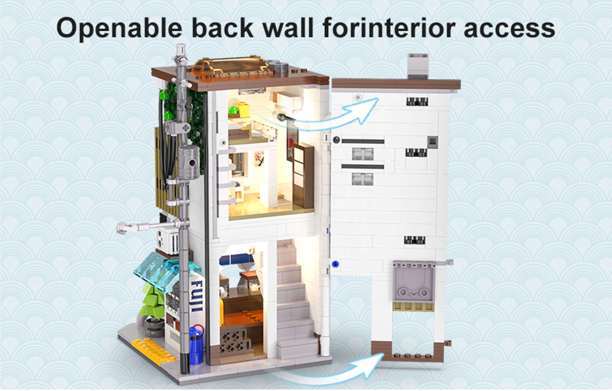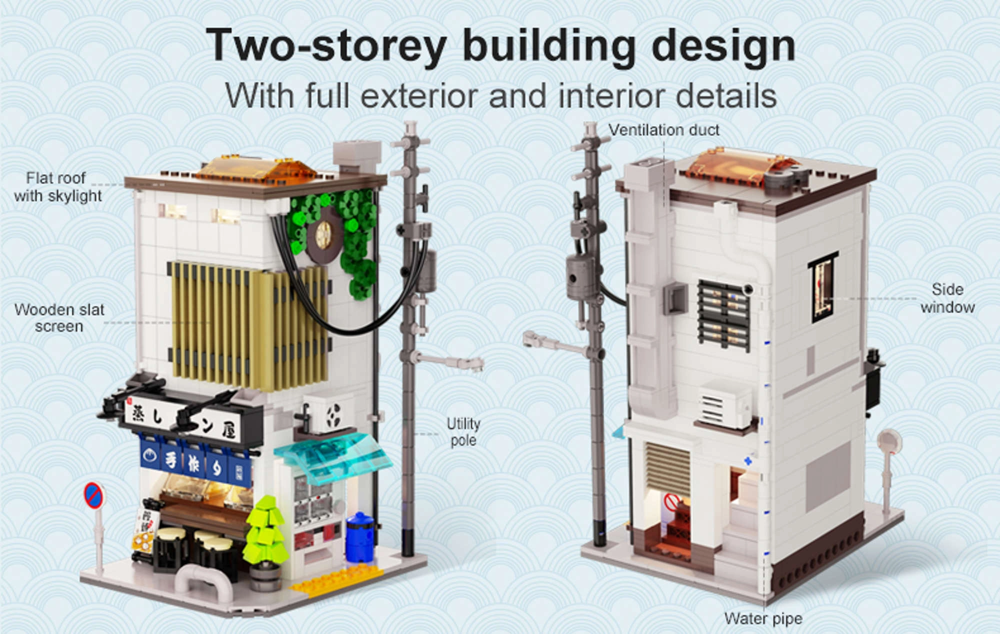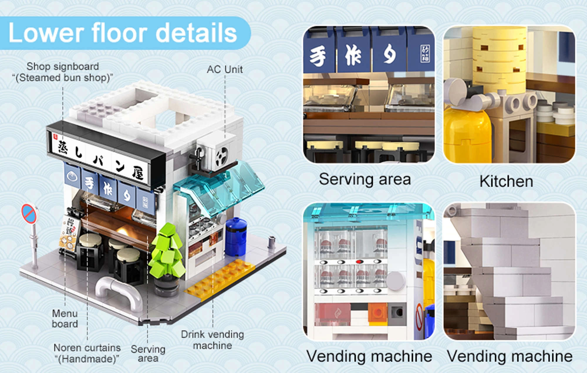 Acest set elegant CaDA aduce atmosfera autentică a străduțelor japoneze. Magazinul cu chifle aburite pe două etaje impresionează prin fațadă realistă, funcții pentru acces facil la interior și modul LED care oferă modelului un farmec unic de seară.
