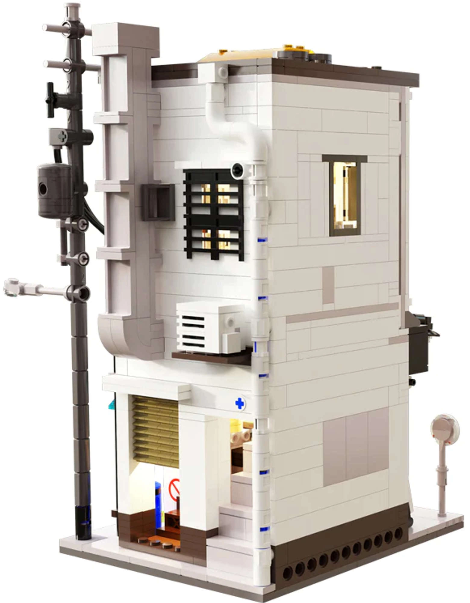 Stâlp electric, canal de ventilație, jgheab, aer condiționat, firmă și automat de băuturi conferă modelului un aspect autentic.
