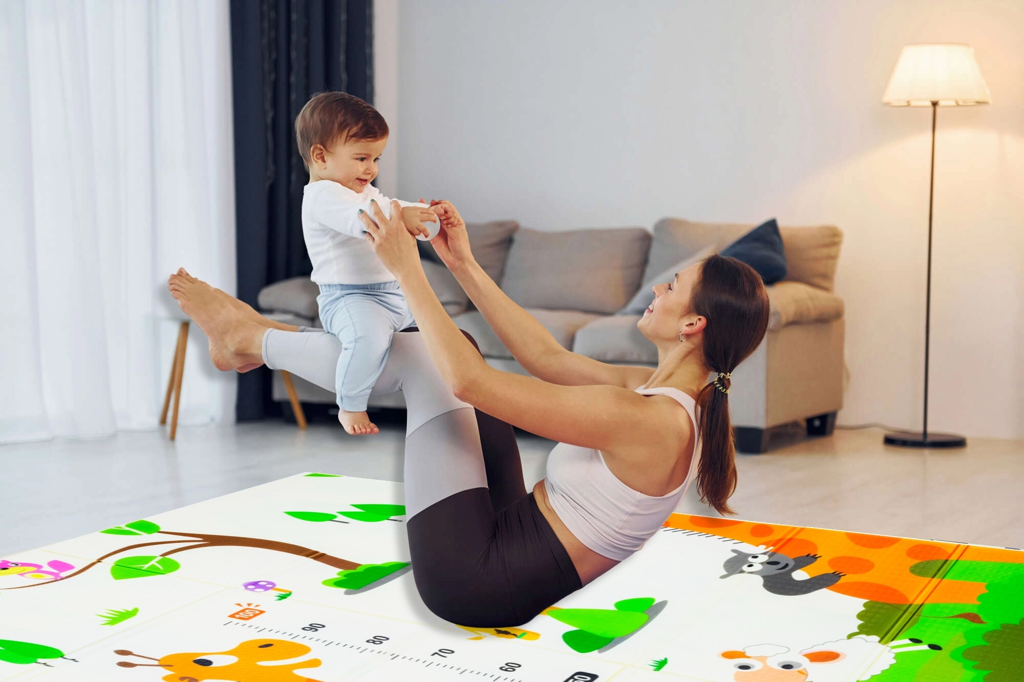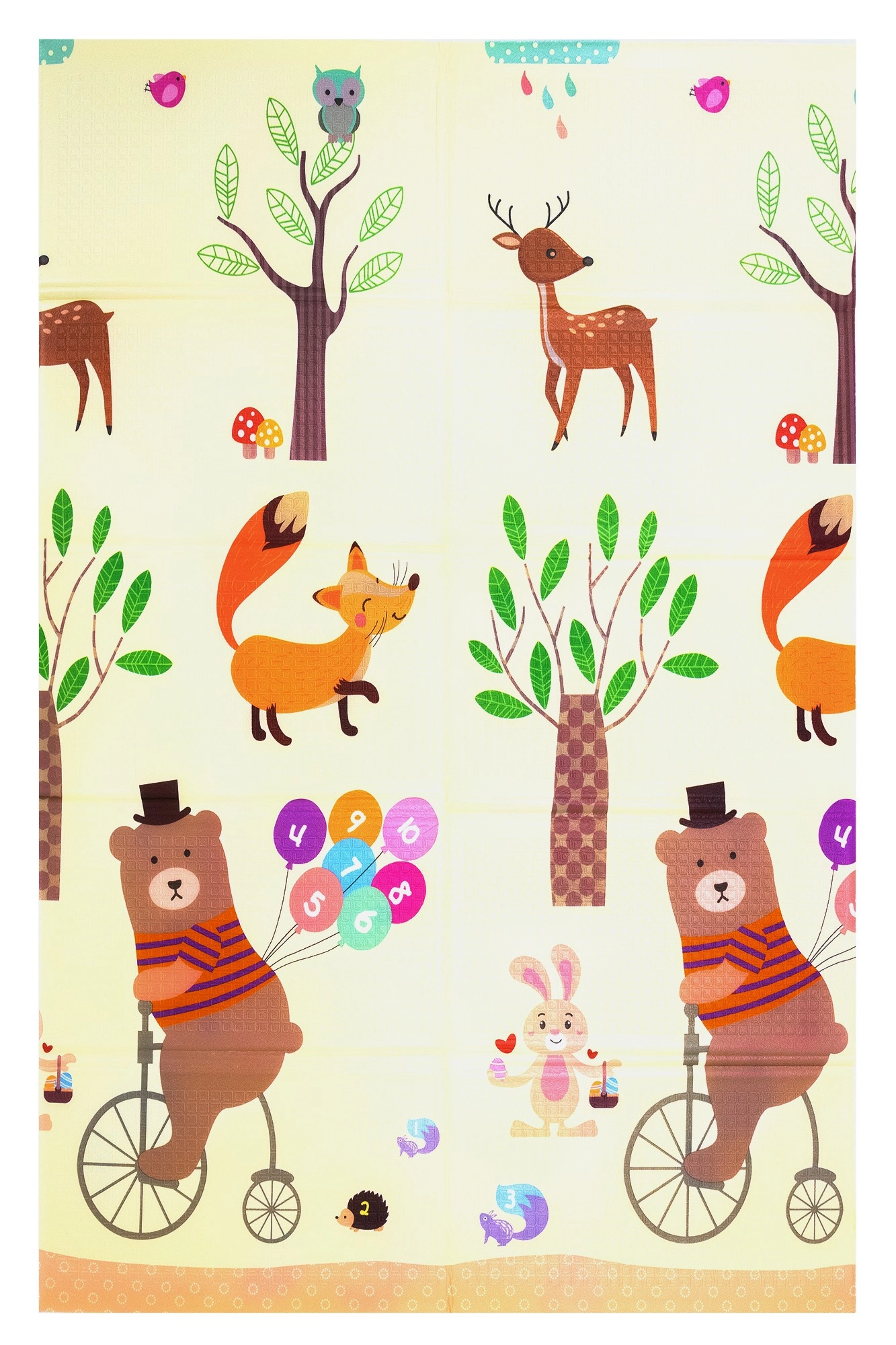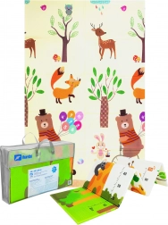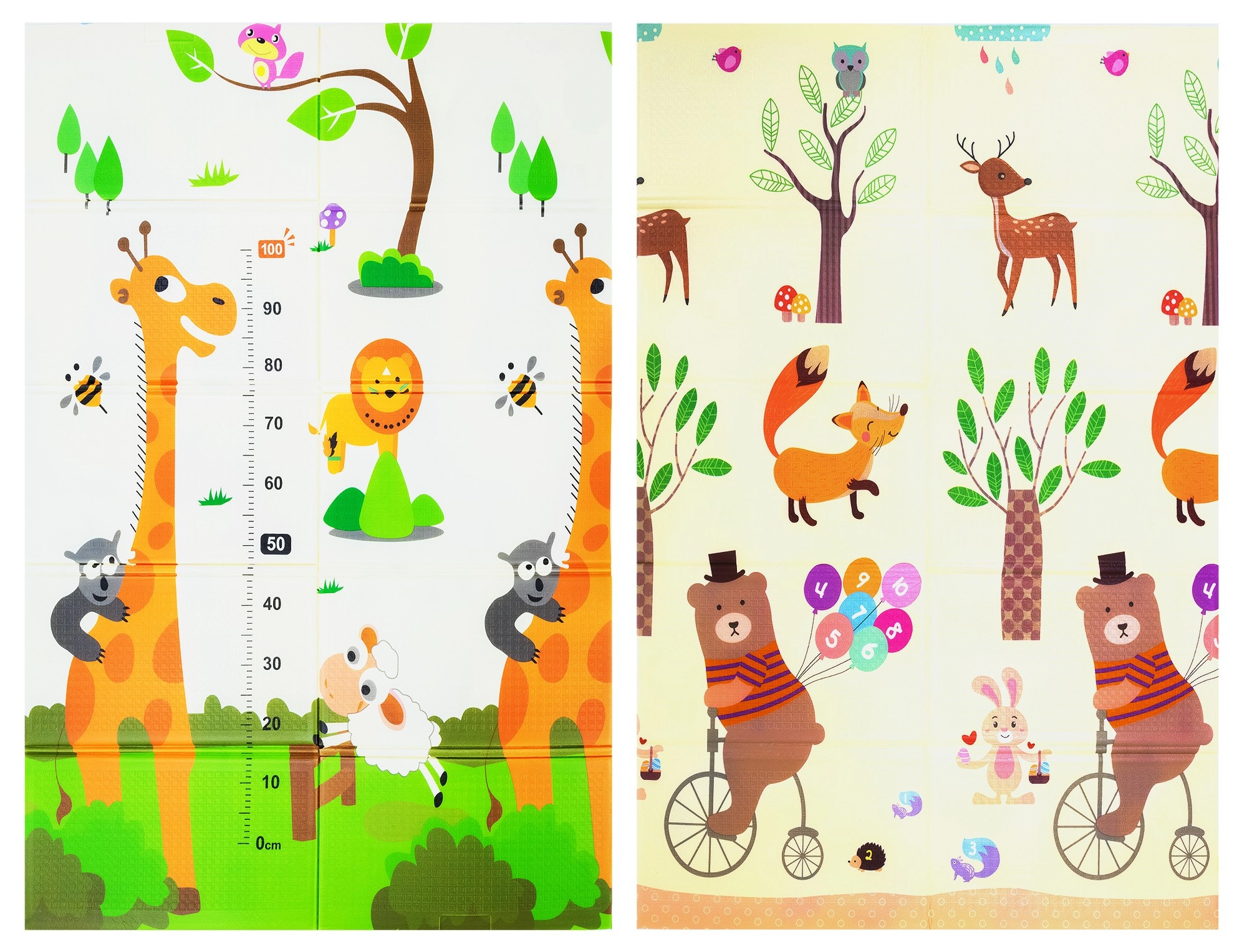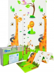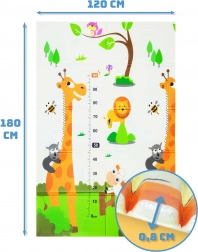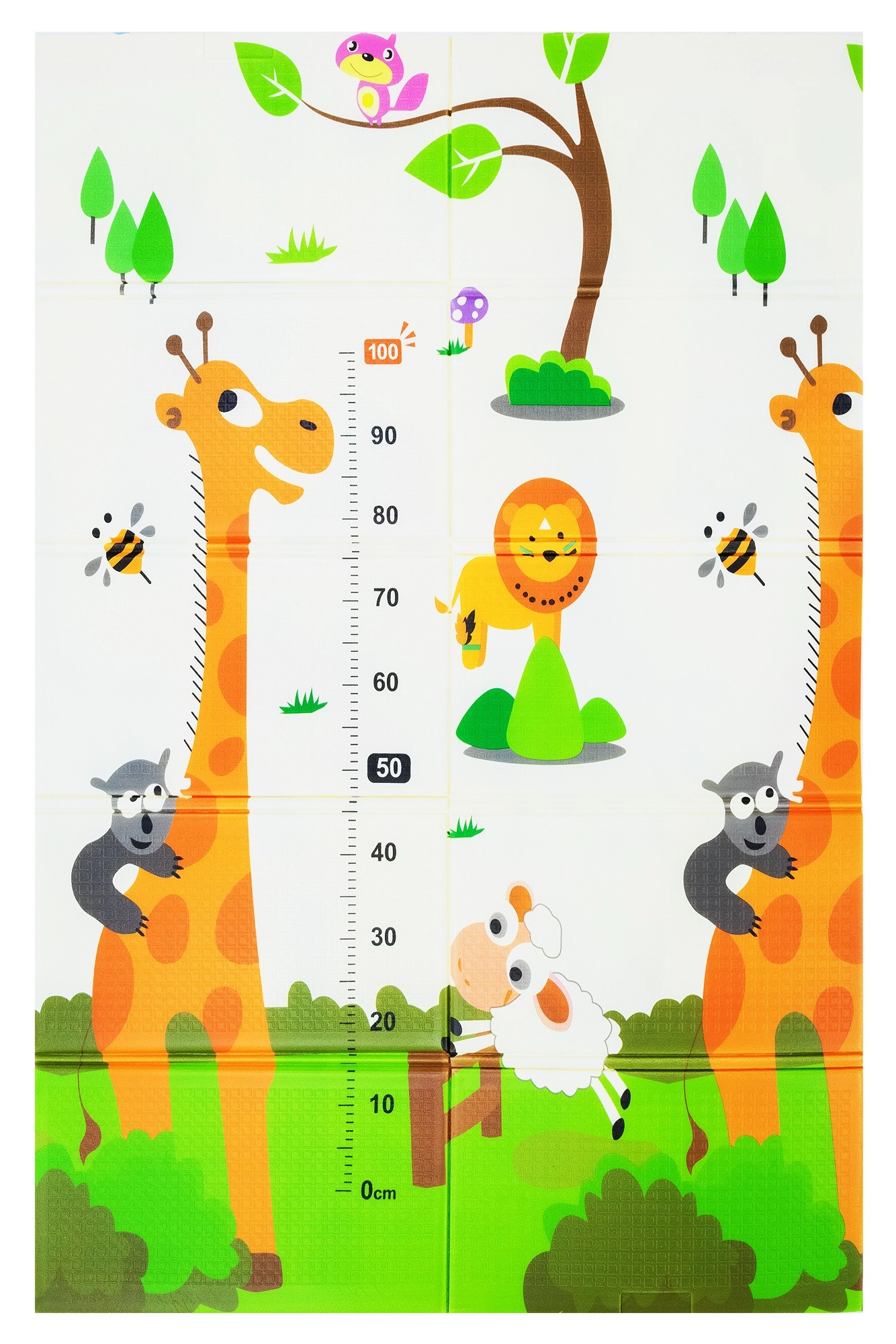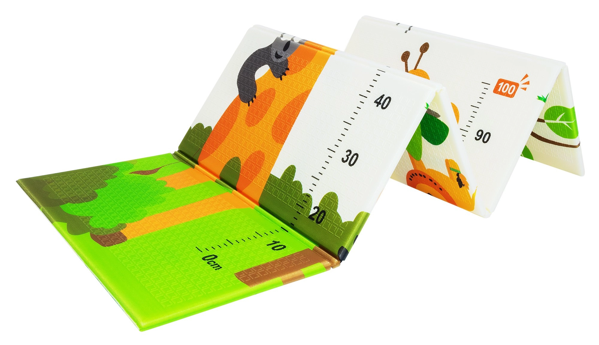 Ușoară, moale și sigură saltea de joacă din spumă XPE premium pentru bebeluși și copii încă de la naștere. Este dublă față (animăluțe / girafe cu riglă de măsurare), rezistentă la apă, pliabilă și se transportă ușor datorită genții de transport incluse. Respectă standardele europene de siguranță EN71 și REACH, nu conține formamidă, ftalați, PVC sau BPA și oferă o excelentă izolație împotriva frigului și o suprafață antiderapantă pentru primele târâri și pași.