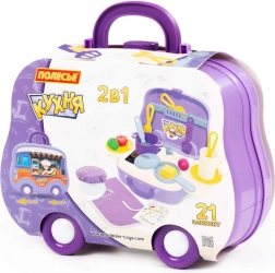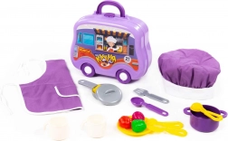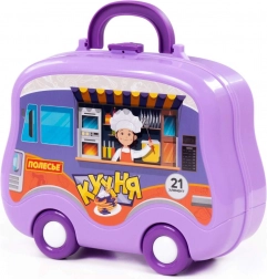 Set de bucătărie pentru copii într-un troler practic cu roți oferă până la 21 de piese pentru jocuri creative de gătit. Cei mici vor fi încântați de șorțul cu bonetă, plita cu chiuvetă, veselă, tacâmuri și alimente din plastic. Ideal pentru dezvoltarea imaginației, a motricității fine și pentru joacă atât acasă, cât și în deplasare datorită trolerului portabil.