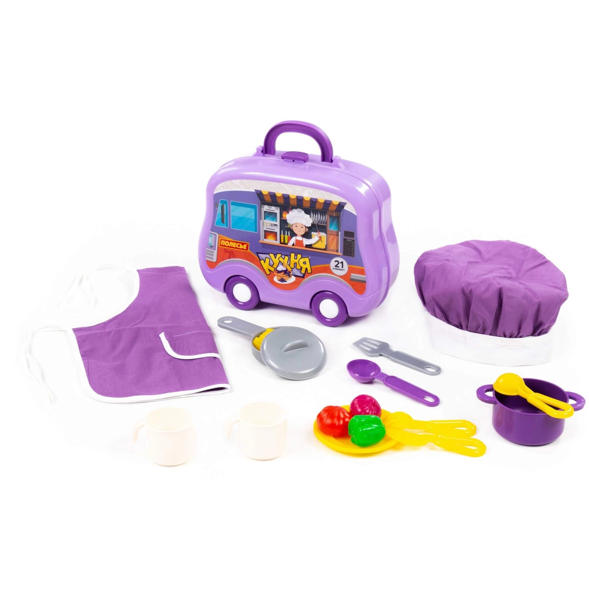 - șorț și bonetă, plită cu chiuvetă, polițe laterale (2 buc), suport pentru tacâmuri, alimente din plastic (cartofi prăjiți, ceapă, ardei, roșie), carte de rețete, set de autocolante, tacâmuri (furculiță, cuțit, lingură), polonic, spatulă, oală cu capac, tigaie, farfurie (2 buc), ceașcă (2 buc)