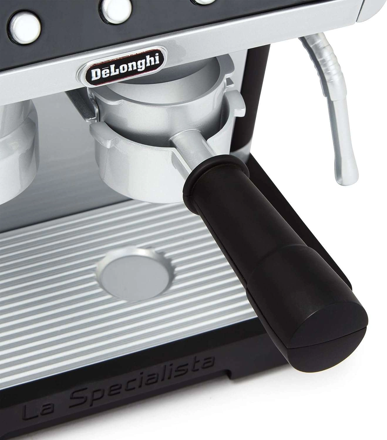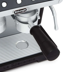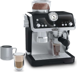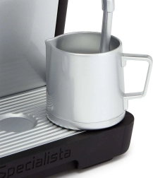 - Espressor cu portafiltru, cană gri pentru lapte, 2 pahare înalte transparente, manetă/tamper, „cafea” și „lapte”, manual