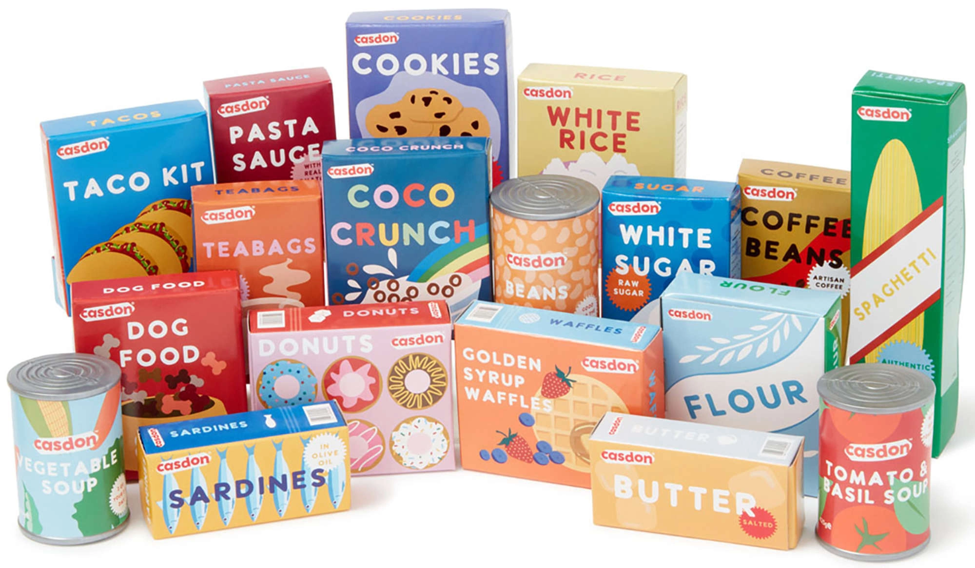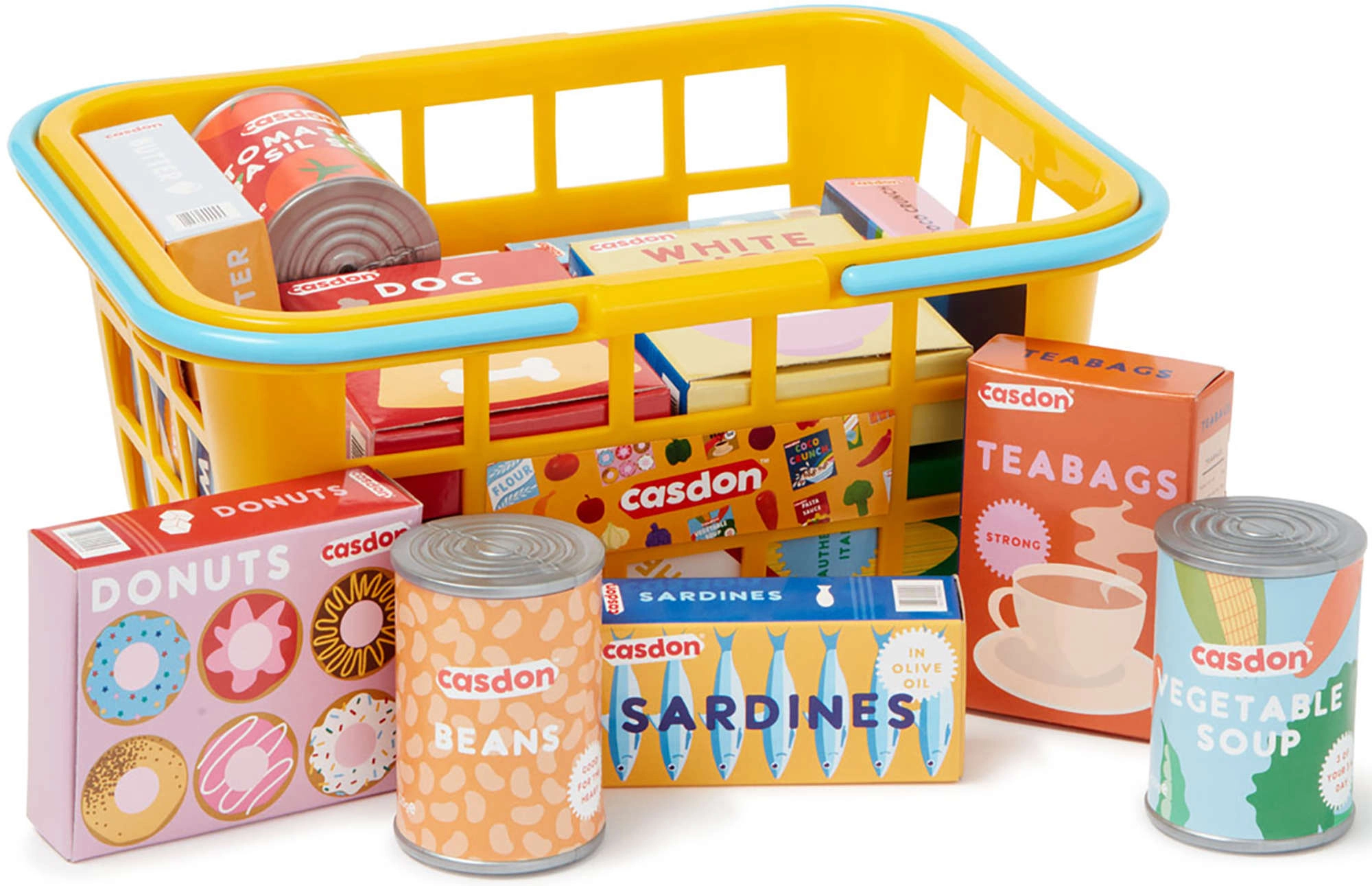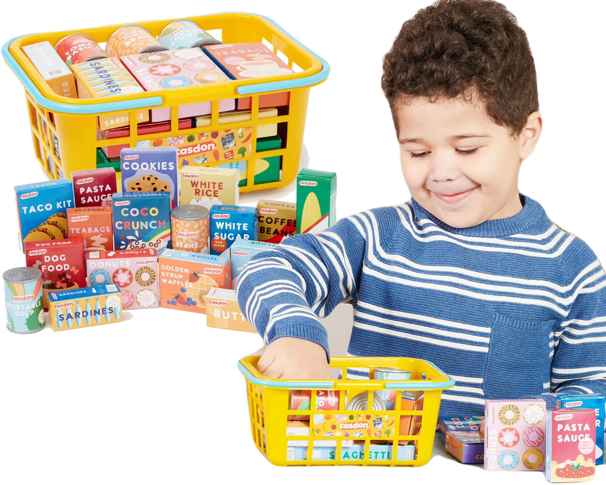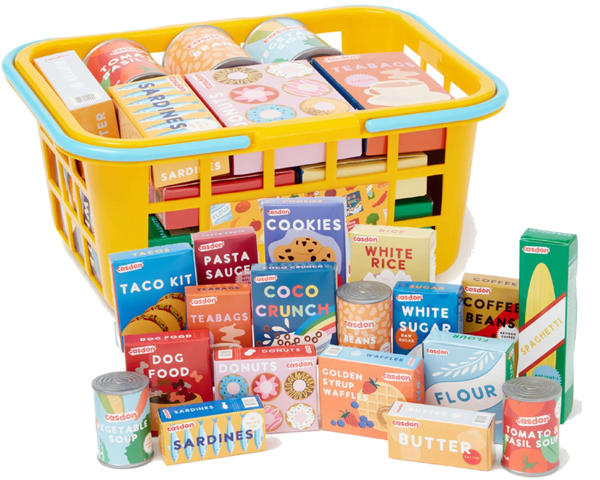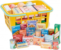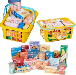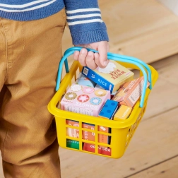 Acest set de calitate de la CASDON este conceput pentru micii iubitori ai jocurilor de magazin. Coșul este ușor, durabil și sigur pentru mâinile copiilor, cu dimensiuni potrivite vârstei. În interior veți găsi o selecție variată de cutii și conserve tipărite realist, care stimulează imaginația și abilitățile de comunicare.