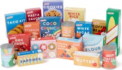 Cutiile și conservele colorate, imprimate cu biscuiți, făină, fasole sau supă, stimulează imaginația și jocul tematic de magazin.