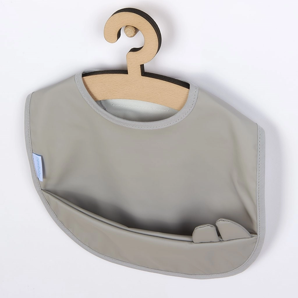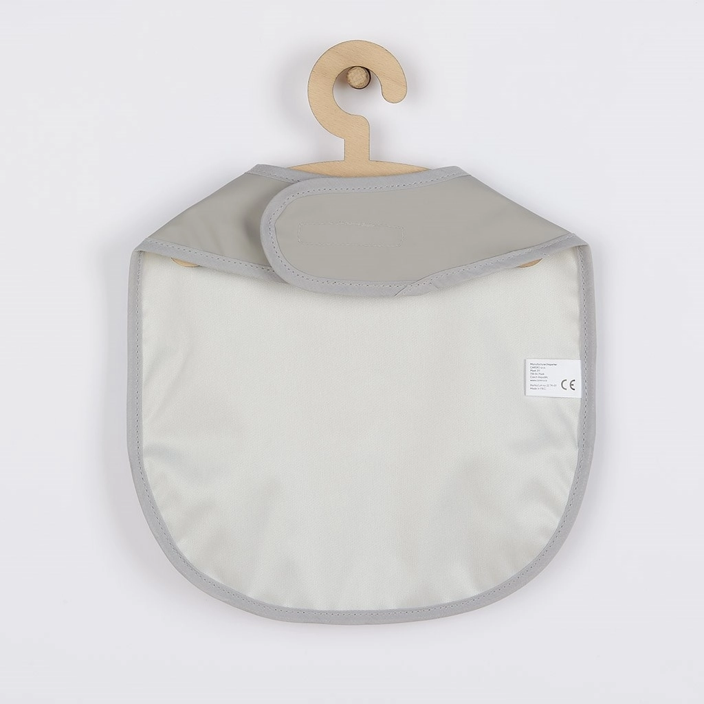 Bavețica practică pentru copii NEW BABY, de culoare gri, protejează în mod fiabil hainele în timpul mesei și jocului. Este din material ușor și moale, se șterge și se spală ușor, are închidere confortabilă cu arici și buzunar practic din două straturi.