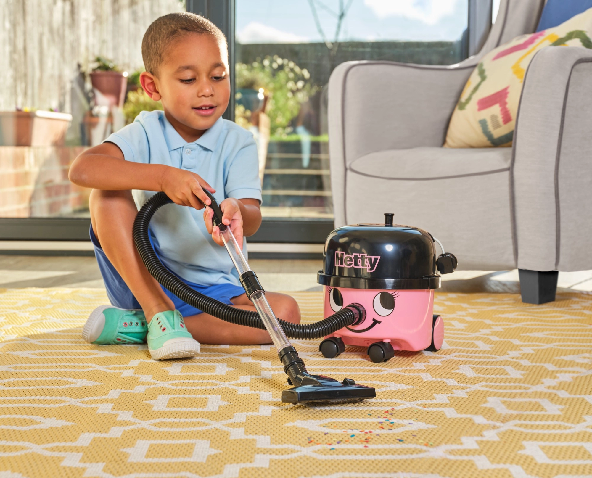 HETTY aspiră delicat particule mici și ușoare (de ex. confetti, firimituri, bile de polistiren), astfel încât copiii se bucură de senzația autentică a curățeniei, în siguranță.