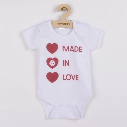 Body pentru bebeluși adorabil și confortabil, cu mânecă scurtă, de la brandul New Baby, cu inscripția MADE IN LOVE, va încânta orice părinte. Este confecționat din 100% bumbac cu vopsele certificate, potrivite pentru bebeluși. Închiderea practică cu capse pe umăr și între piciorușe facilitează îmbrăcarea și schimbarea scutecului.