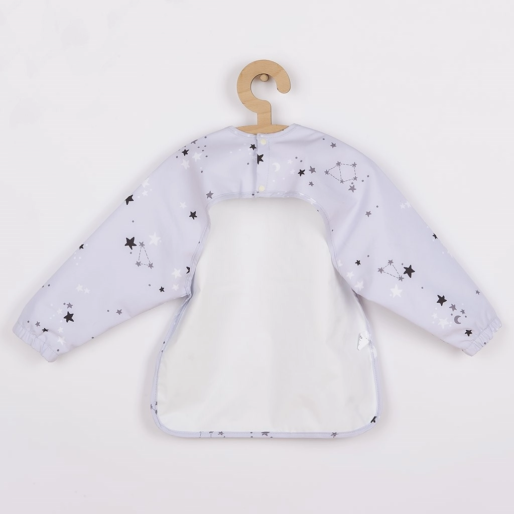 Bavețica–șorț pentru copii cu mânecă lungă New Baby protejează fiabil hainele în timpul mesei și al activităților creative. Este realizată din material ușor și moale, are închidere comodă cu 2 capse și o buzunară practică. Stratul inferior este impermeabil, astfel încât este suficient să ștergeți cu o cârpă umedă sau să spălați la mașină. Datorită mânecilor lungi, este ideală și pentru pictură și jocuri creative.