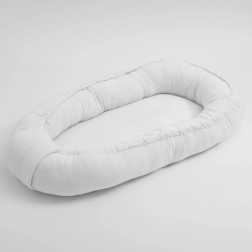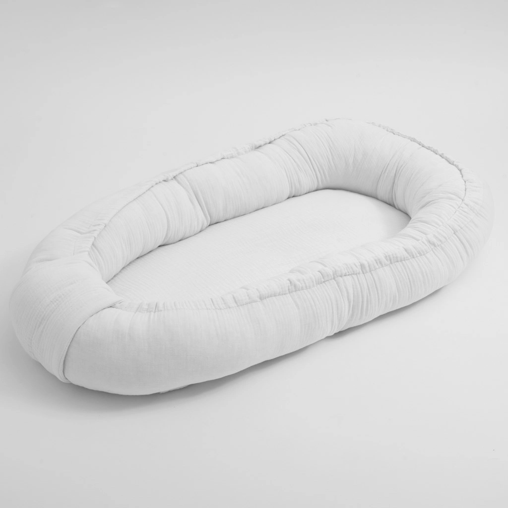 Cuibul din muselină New Baby, în culoare albă, oferă bebelușului un spațiu sigur și confortabil acasă și în călătorii. Datorită marginilor moi și materialului respirabil din bumbac, micuțul se simte liniștit și în siguranță, putând astfel dormi mai bine, se odihni și se juca. Ideal pentru a fi așezat în pătuț, pe canapea, pe podea sau în cărucior.