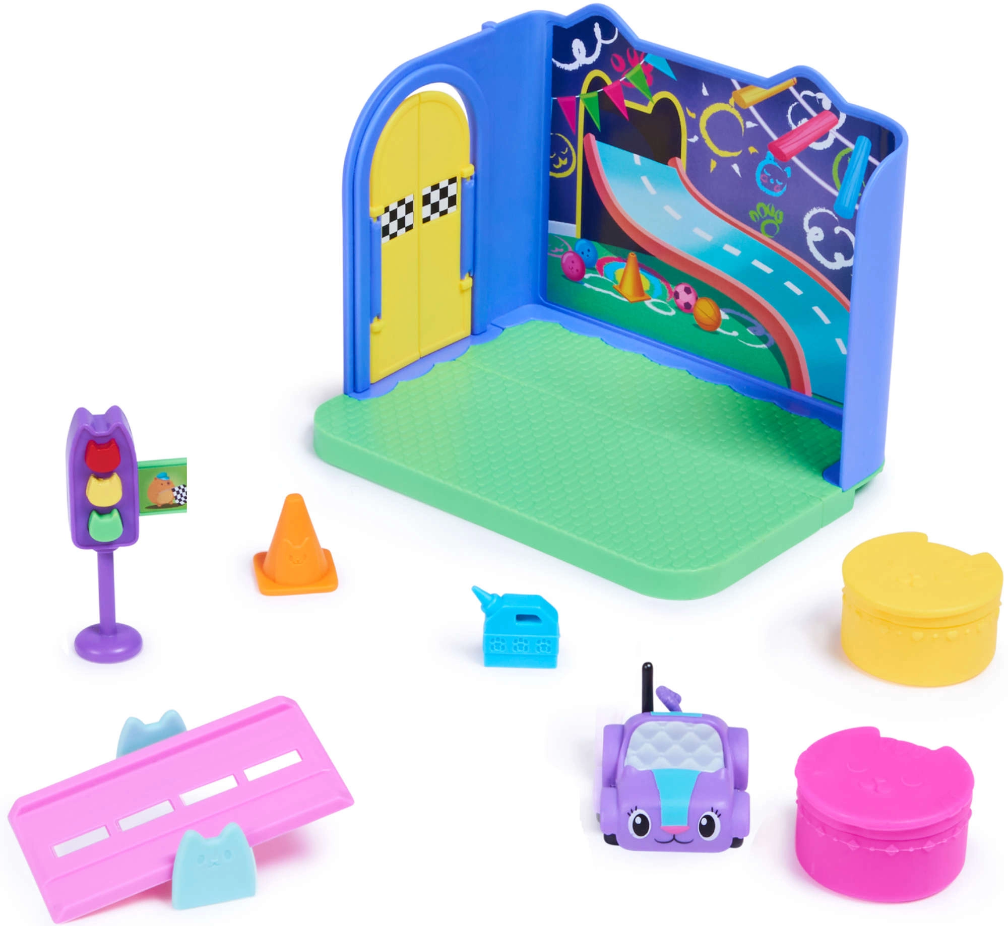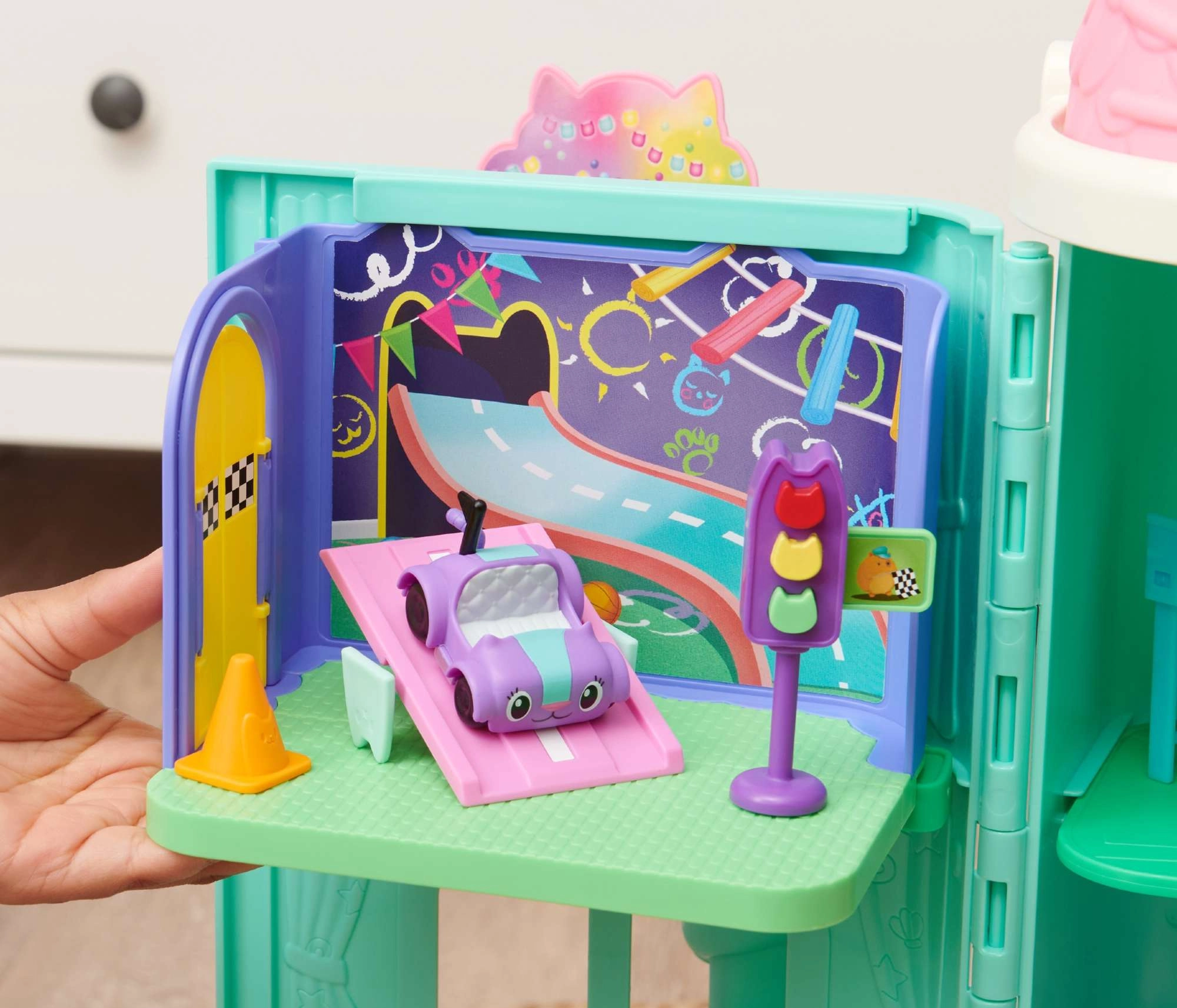 Descoperă camera colorată a lui Kocifur, inspirată de îndrăgitul serial GABBY’S DOLLHOUSE. Copiilor le va plăcea coborârea pe rampă, oprirea la semafor și deschiderea surprizelor din cutiuțe. Setul stimulează imaginația, motricitatea fină și crearea propriilor povești.