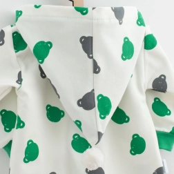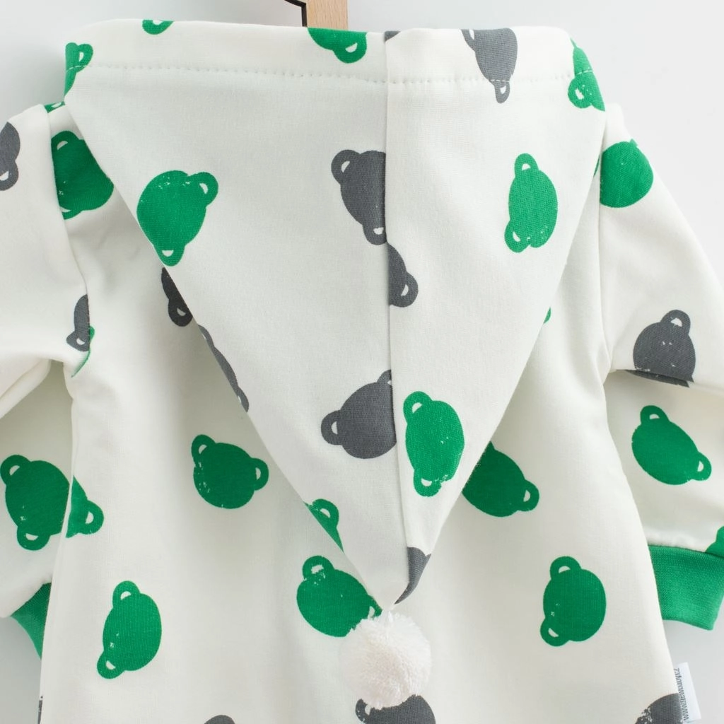 Salopetă pentru bebeluși cu glugă NEW BABY Little One, adorabilă și practică, ce încântă prin confort și aspect. Are imprimeu integral cu ursuleți, fermoar pe toată lungimea pentru îmbrăcare ușoară, mâneci și pantaloni cu manșete elastice și glugă cu căptușeală colorată și ciucure. Fabricată din trening gros/jersey moale, ideală pentru purtare pe tot parcursul anului.