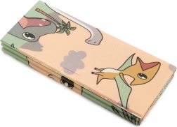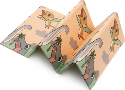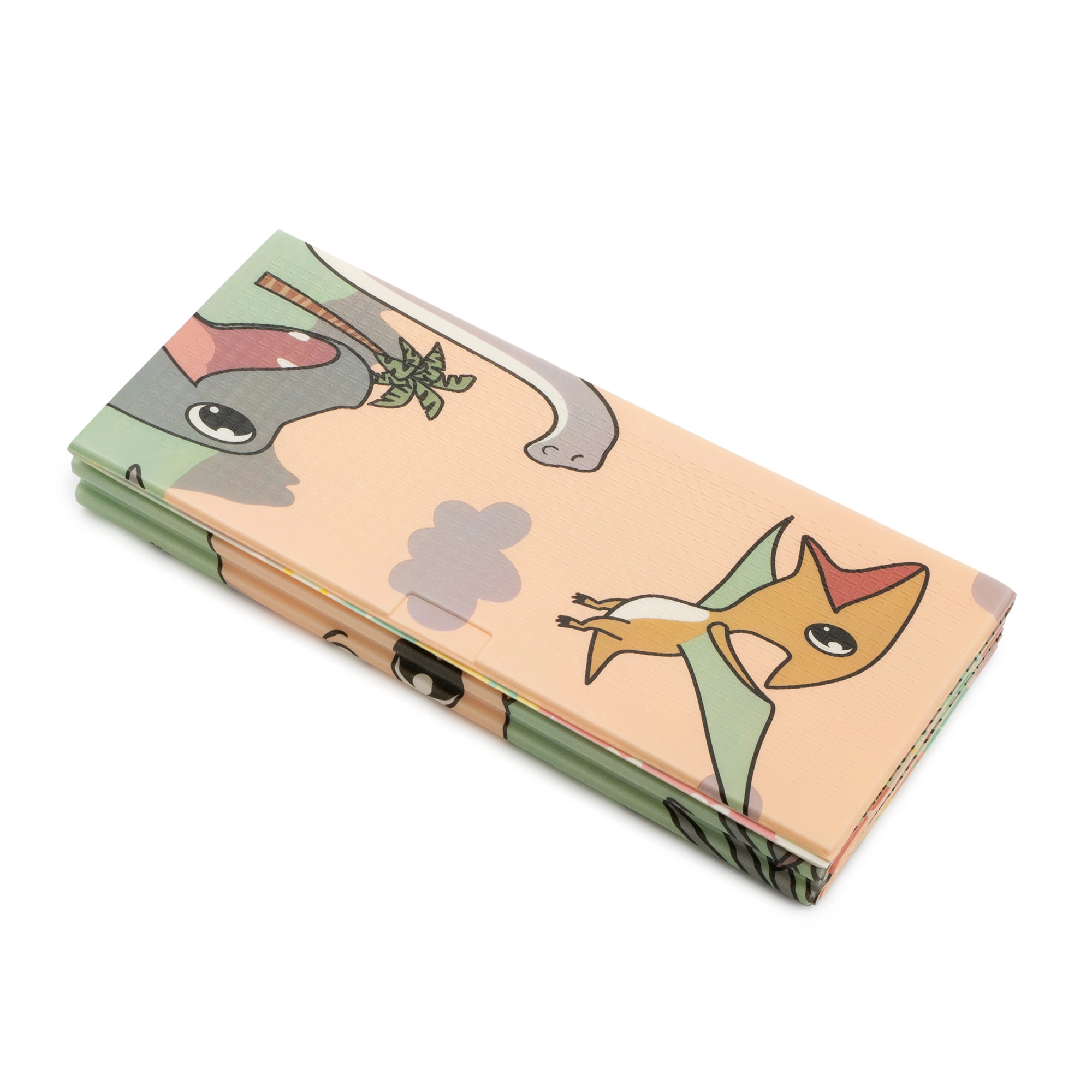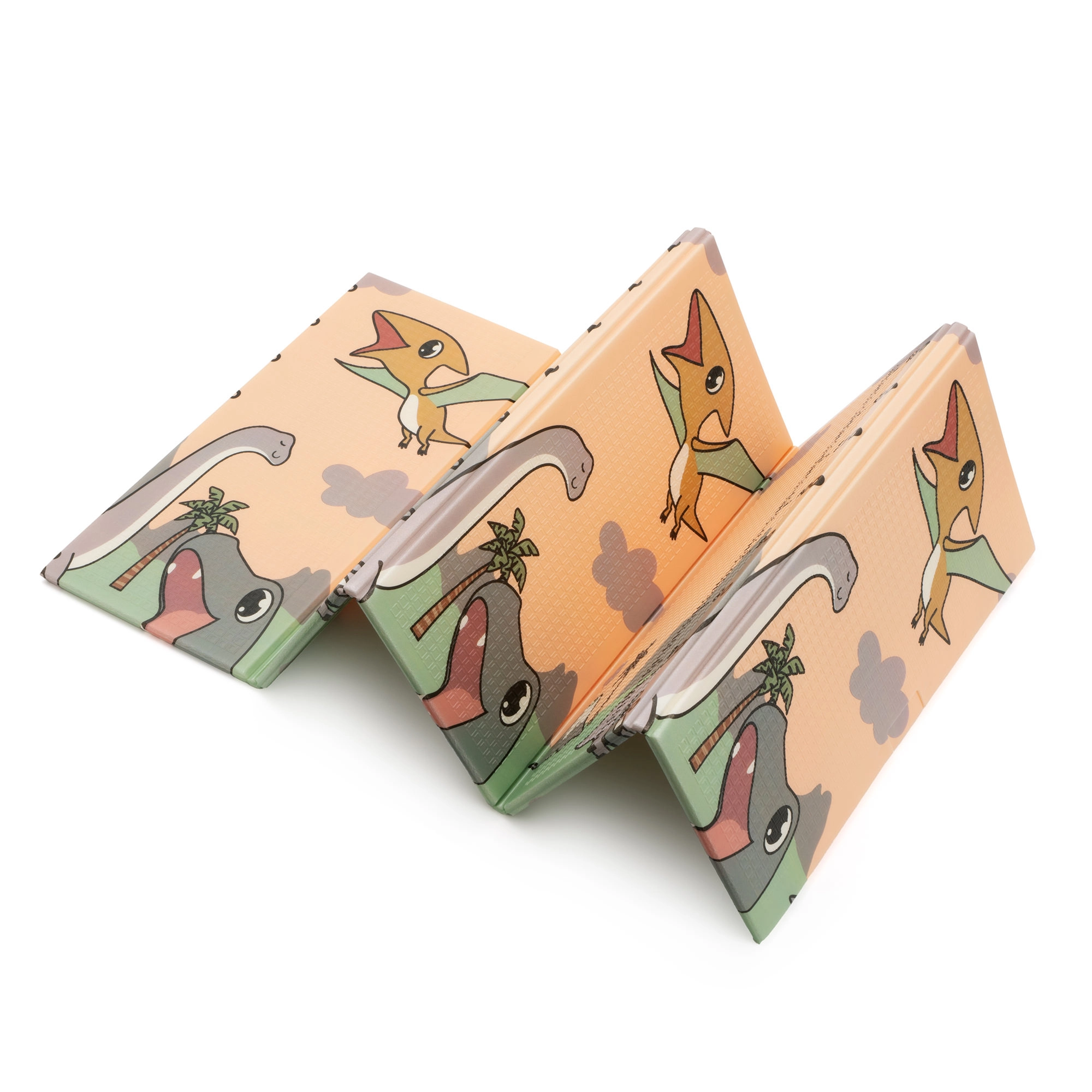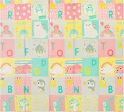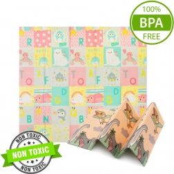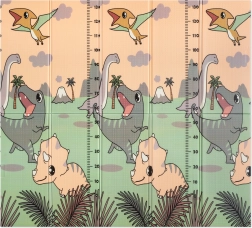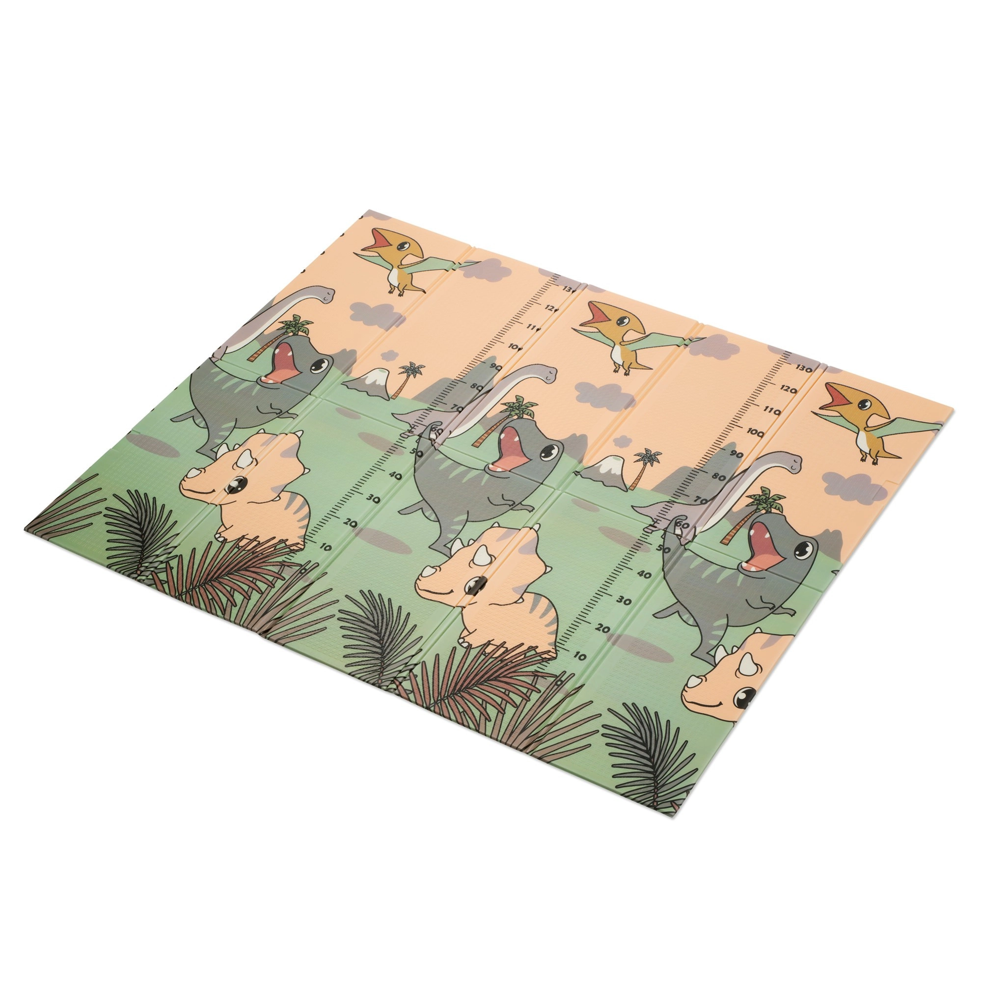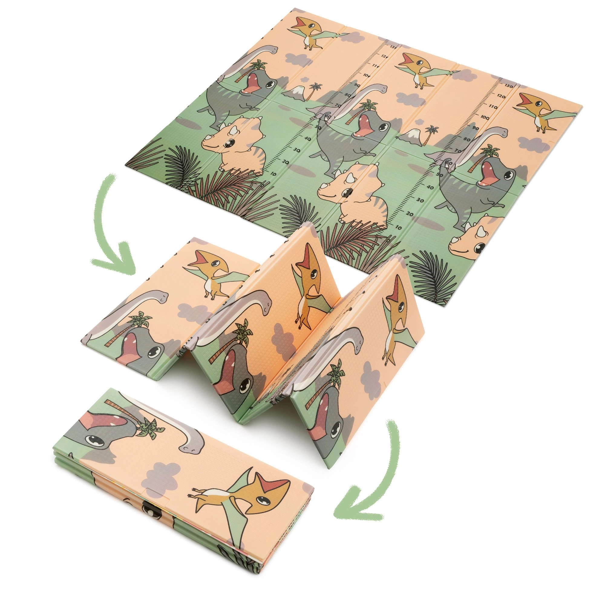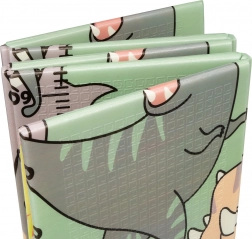 Ambele fețe au imprimare educativă în culori pastelate delicate: dinozauri drăguți cu riglă de înălțime și motiv cu animăluțe și litere. Relieful antiderapant susține învățarea sigură a târâtului și mersului și, totodată, stimulează dezvoltarea senzorială. Suprafața este rezistentă la apă și se șterge simplu cu o cârpă umedă.