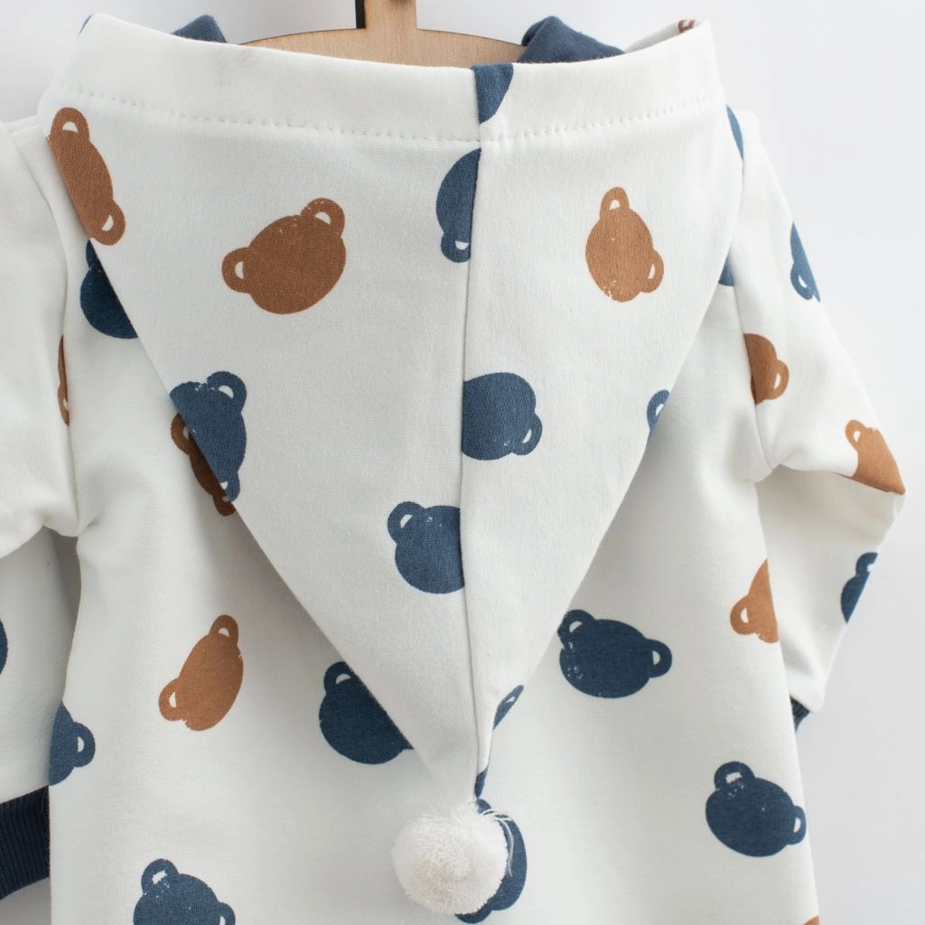 Salopeta are imprimeu integral cu ursuleți și este completată de manșete elastice la mâneci și la pantaloni, care își mențin forma și protejează împotriva frigului. O alegere grozavă pentru acasă, la plimbare sau pentru cărucior – o piesă versatilă pentru tot anul.