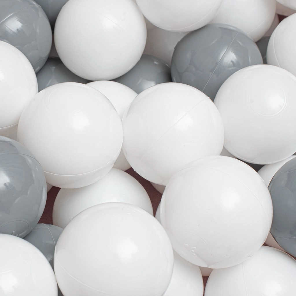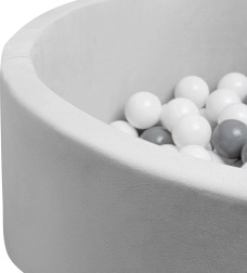 Piscina se potrivește atât în interioare moderne, cât și clasice, și se mută sau se curăță ușor datorită întreținerii simple și husei detașabile cu fermoar ascuns. Pachetul include 150 de bile din plastic în culorile alb și gri, care sunt certificate și respectă normele de siguranță prevăzute.