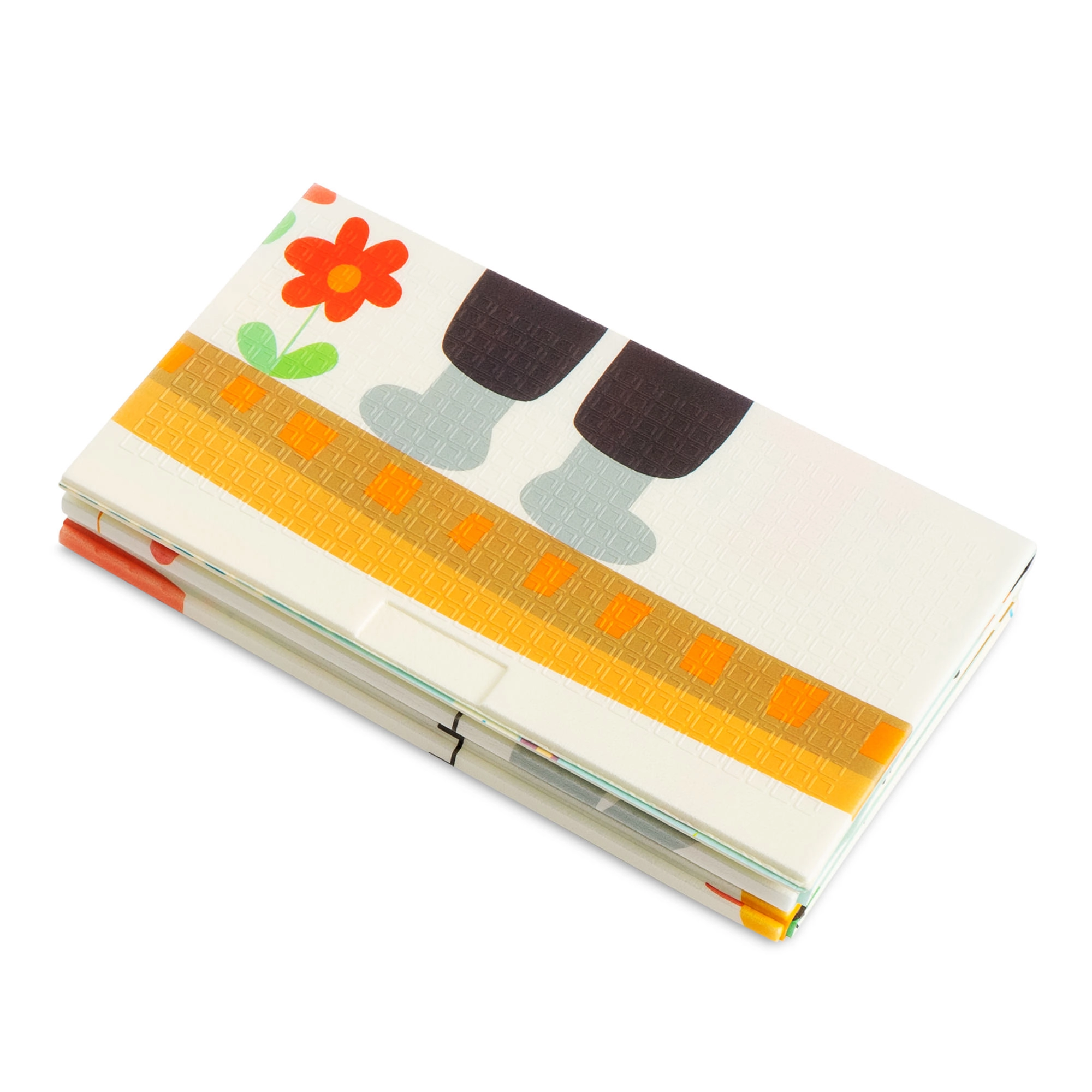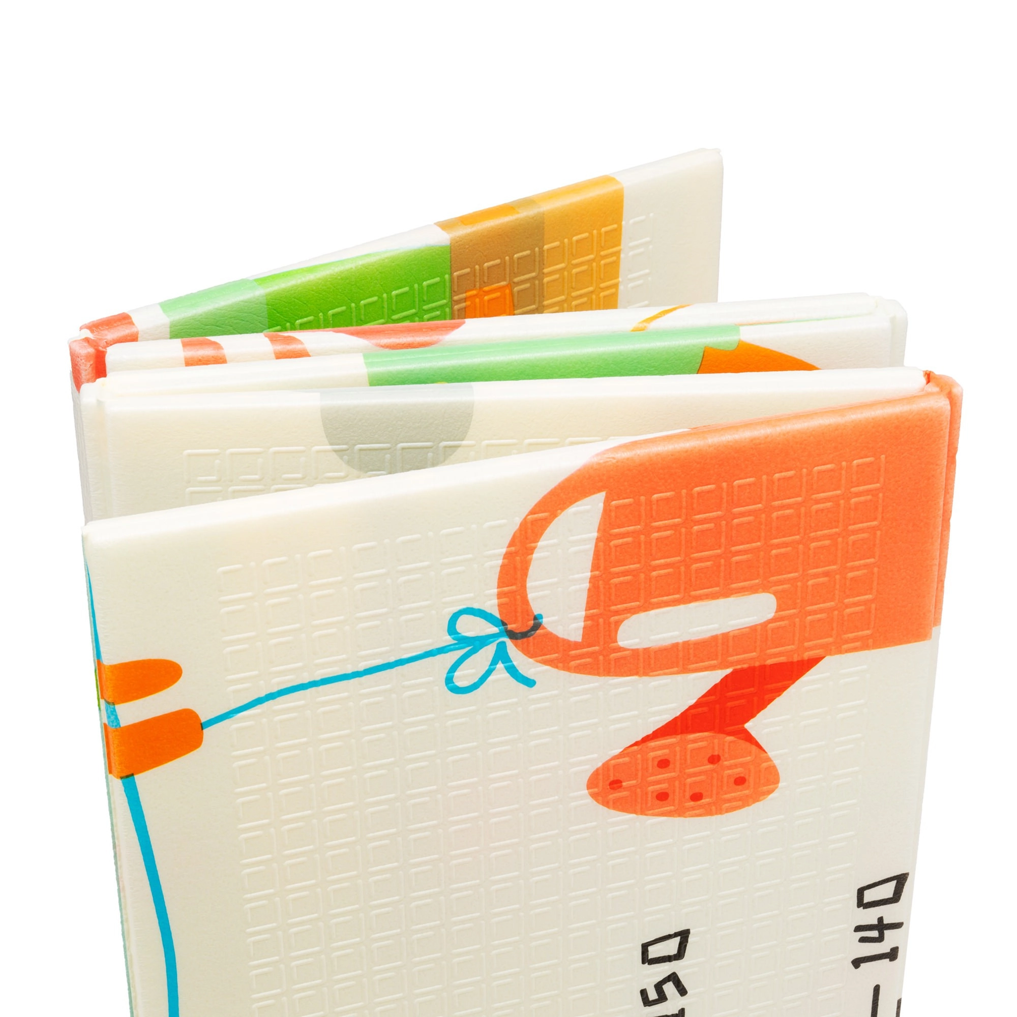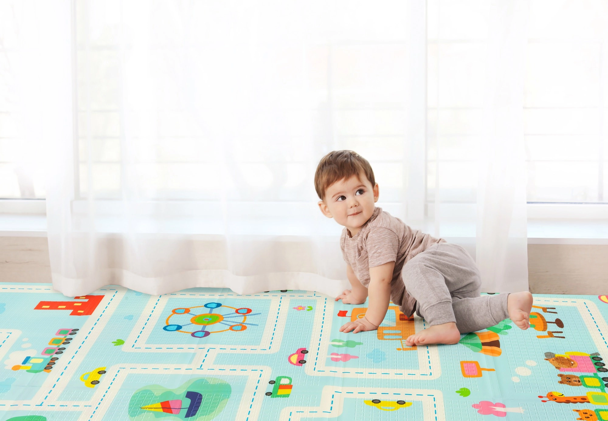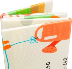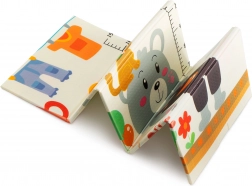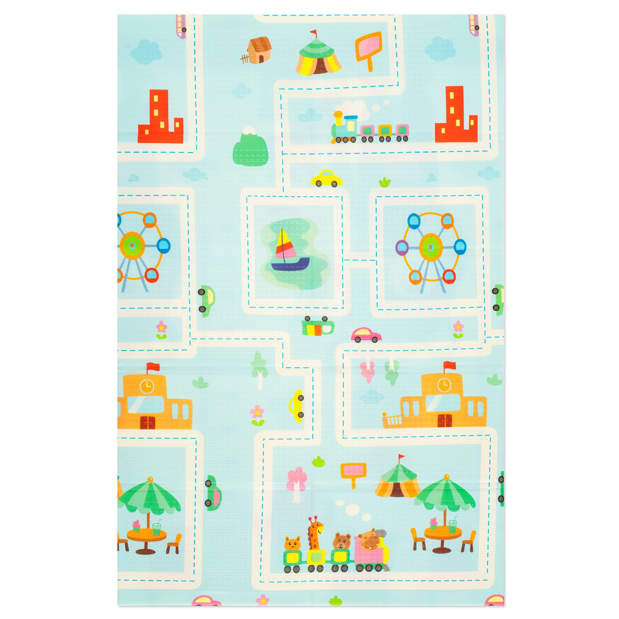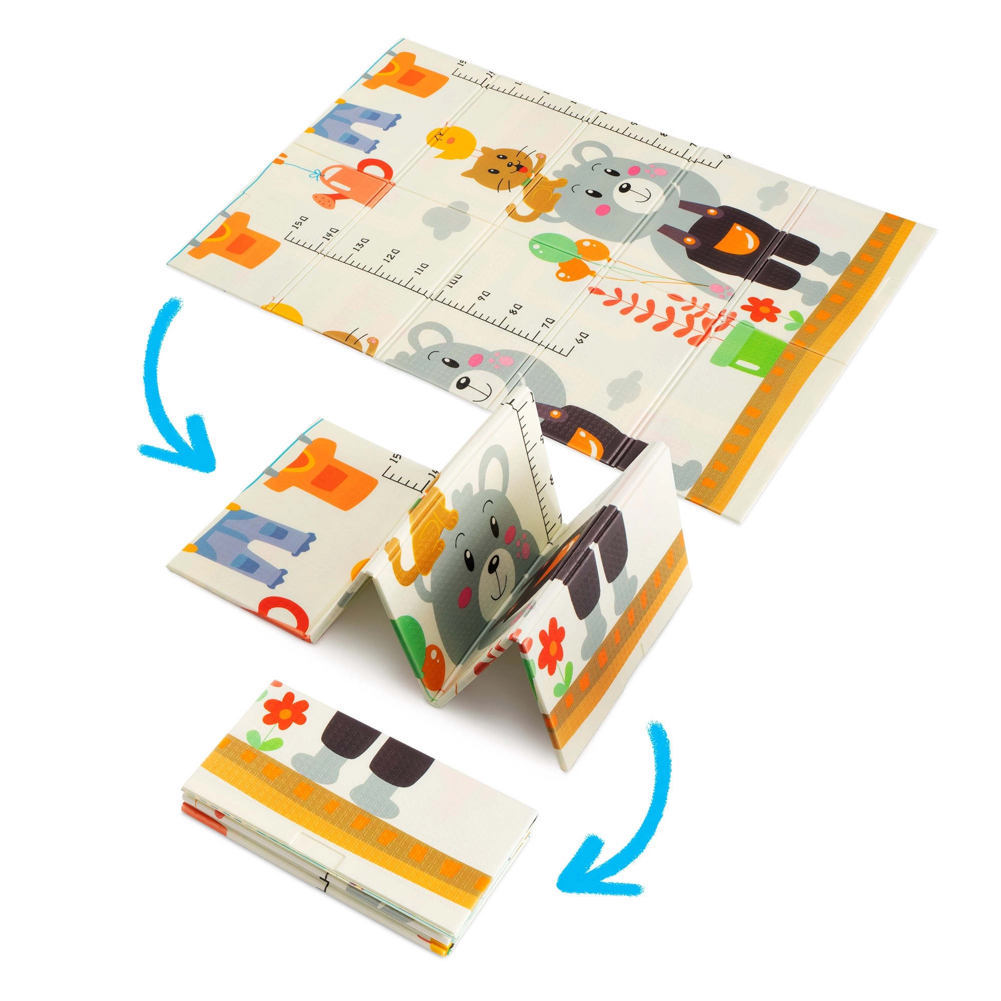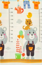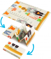Designul cu două fețe aduce două motive educative: animăluțe vesele cu riglă de înălțime pentru monitorizarea creșterii și drumuri cu clădiri și vehicule colorate pentru dezvoltarea imaginației. Salteluța se pliază în câteva secunde, se depozitează ușor și, datorită genții cu fermoar incluse, o puteți lua oriunde – în living, în camera copilului, pe balcon, în grădină sau în călătorii.
