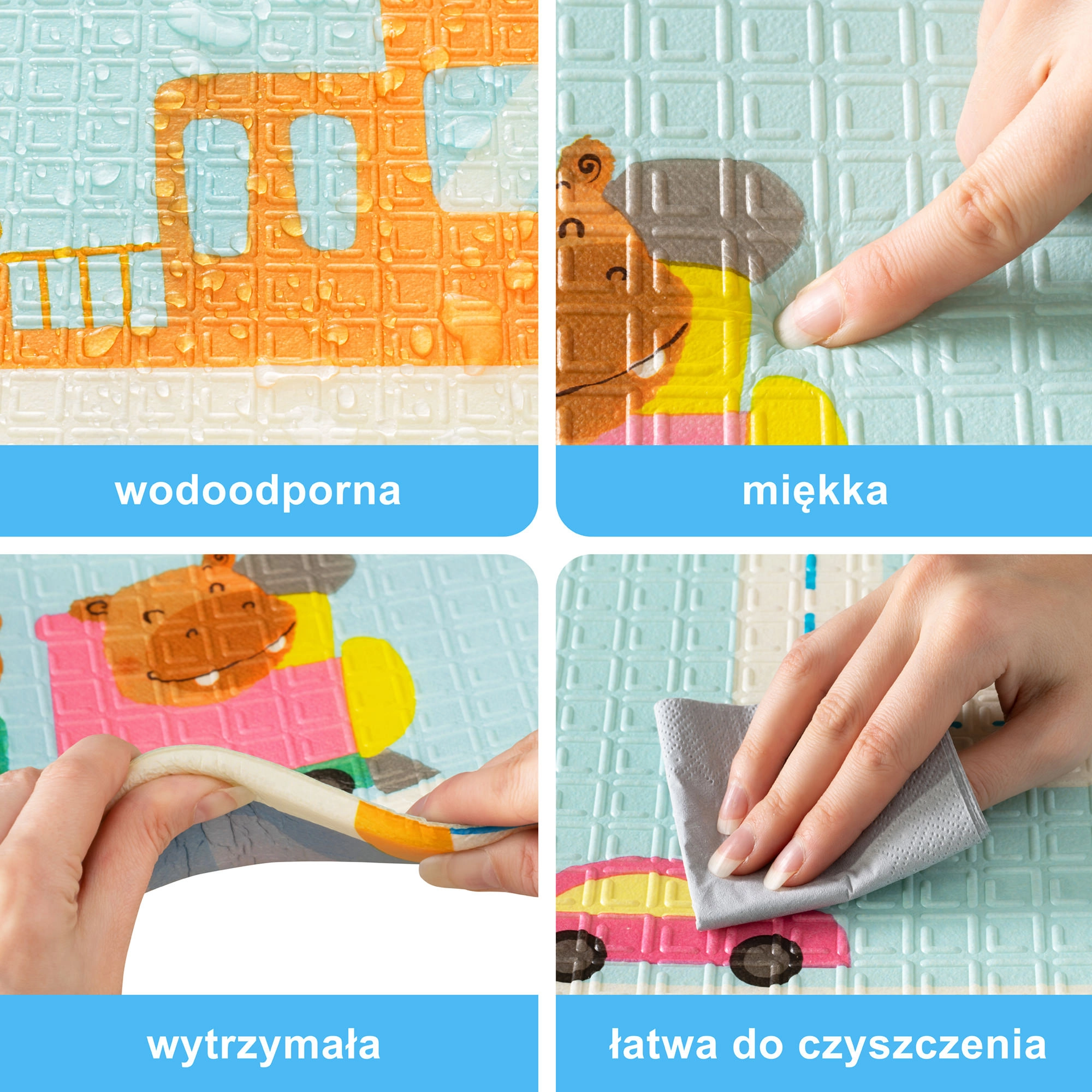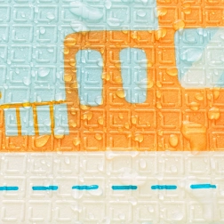 Spuma XPE groasă, elastică și netoxică absoarbe excelent șocurile, izolează de frigul podelei și este inodoră. Suprafața este rezistentă la apă și ușor de curățat.