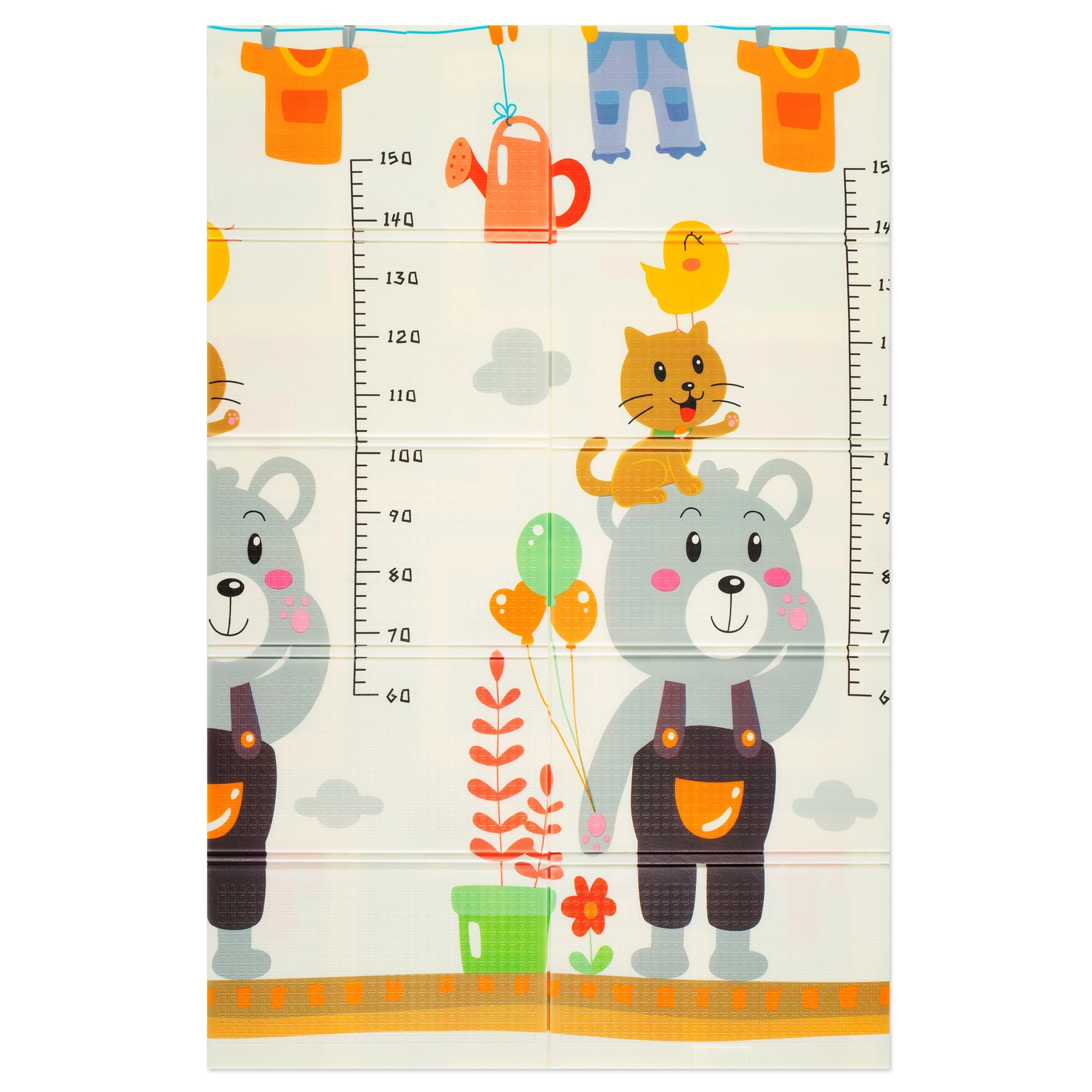O față oferă motive vesele cu animăluțe și riglă de înălțime, cealaltă față drumuri și clădiri colorate pentru dezvoltarea imaginației și a percepției senzoriale.