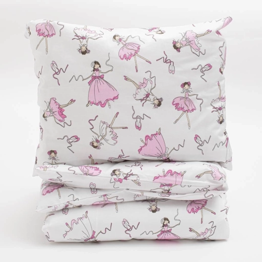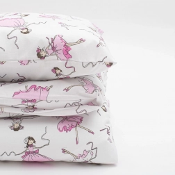 Motivul romantic cu balerină face camera copilului mai primitoare și încântă prin culori delicate, liniștitoare. Setul este conceput astfel încât să nu se decoloreze și să nu păteze hainele, păstrându-și mult timp aspectul frumos și funcționalitatea.