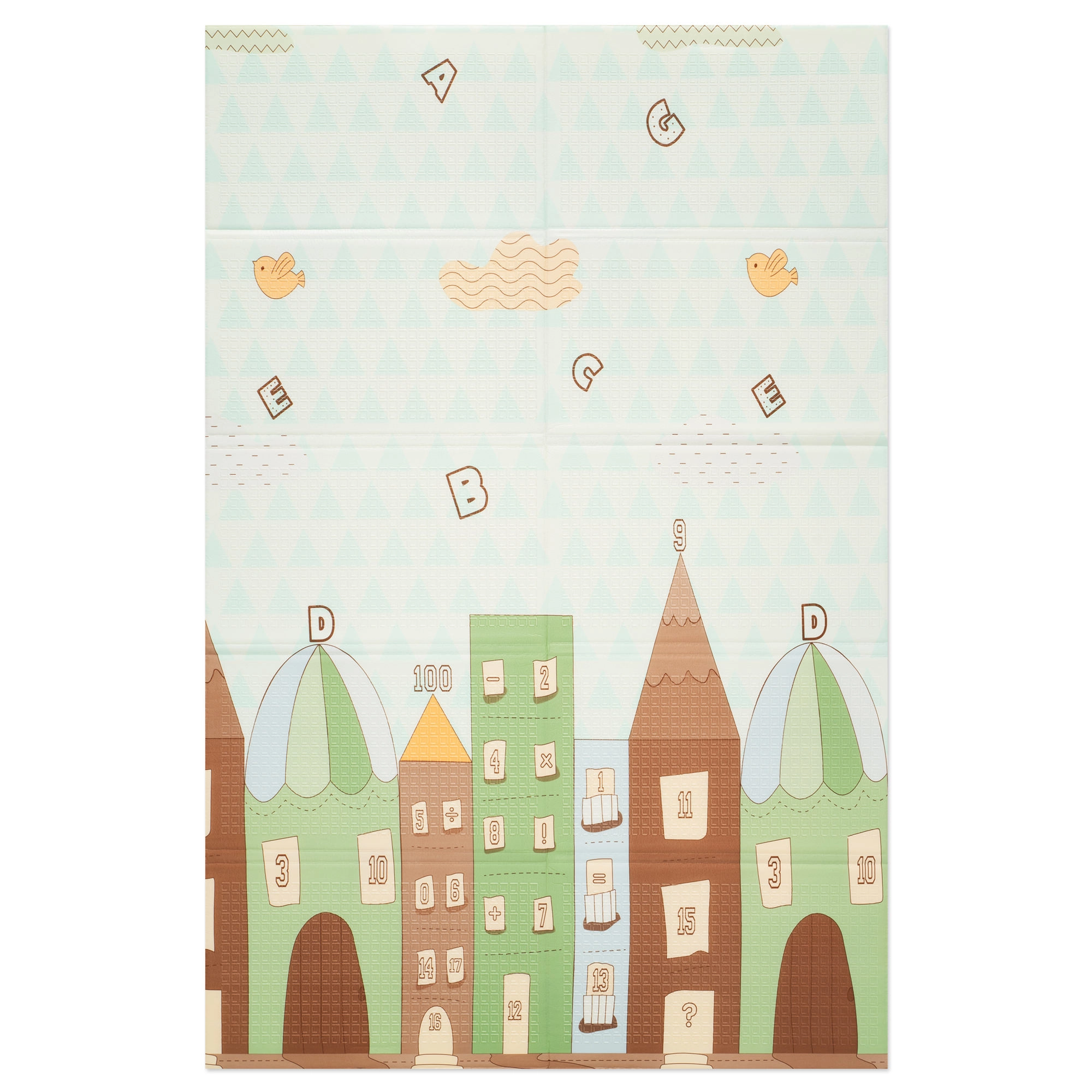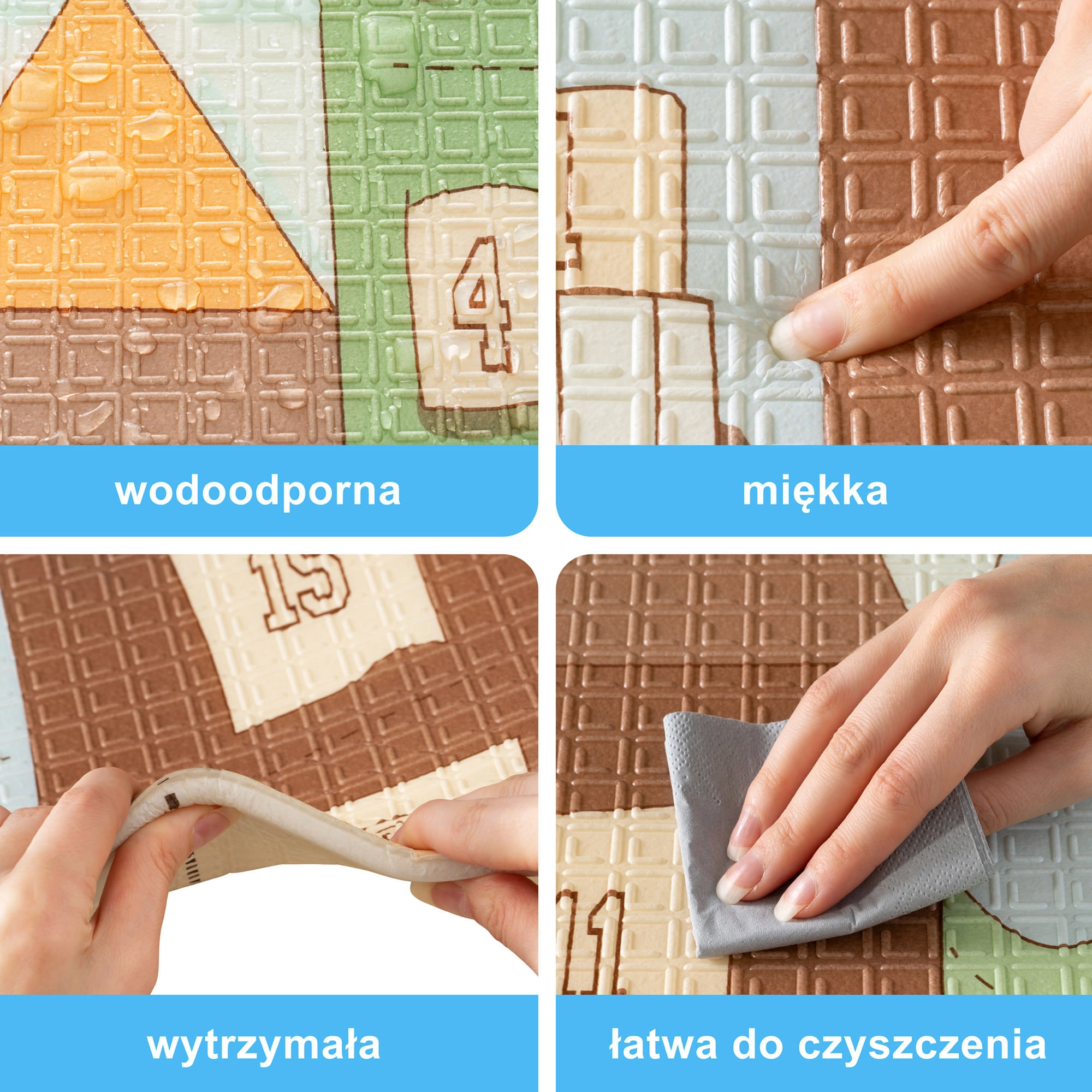 Salteaua de joacă de mari dimensiuni HUMBI din spumă XPE premium creează un loc confortabil și igienic pentru bebeluși și copii mai mari. Datorită grosimii de 0,8 cm, absoarbe foarte bine șocurile, izolează de frig, iar suprafața ușor reliefată, antiderapantă sprijină învățarea în siguranță a târâtului și mersului. Datorită designului cu două fețe și motivelor drăguțe cu animăluțe, căsuțe și numere, înveselește cu ușurință orice cameră de copil sau living.