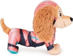 Cățelușa de pluș Liberty, în ținută portocaliu‑turcoaz, are detalii brodate, urechiușe foarte moi și cusături de calitate. Materialele premium asigură durabilitate și siguranță în timpul jocului pentru copii.