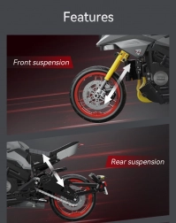 Datorită elementelor mobile te vei bucura atât de construcție, cât și de prezentare: modelul are ghidon rotativ, motor transparent cu pistoane mobile conectat la roata din spate, lanț funcțional, cutie de viteze cu trei trepte, suspensie funcțională și cric reglabil. Nu lipsesc farul, oglinzile, bordul, discurile de frână și carenele modelate cu precizie.