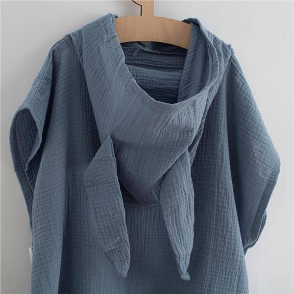 Poncho muselină pentru copii New Baby Feeling, ușor și absorbant, în culoare albastră, este ideal după baie acasă, la piscină și la apă. Datorită materialului din 100% bumbac este aerisit, delicat cu pielea și oferă o protecție excelentă împotriva frigului. Croiala practică, lejeră, cu urechiușe drăgălașe și capse laterale facilitează îmbrăcarea și „crește” împreună cu copilul.