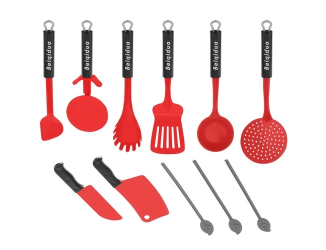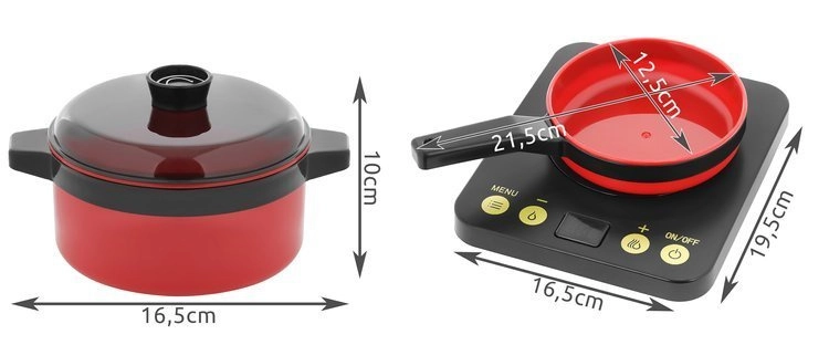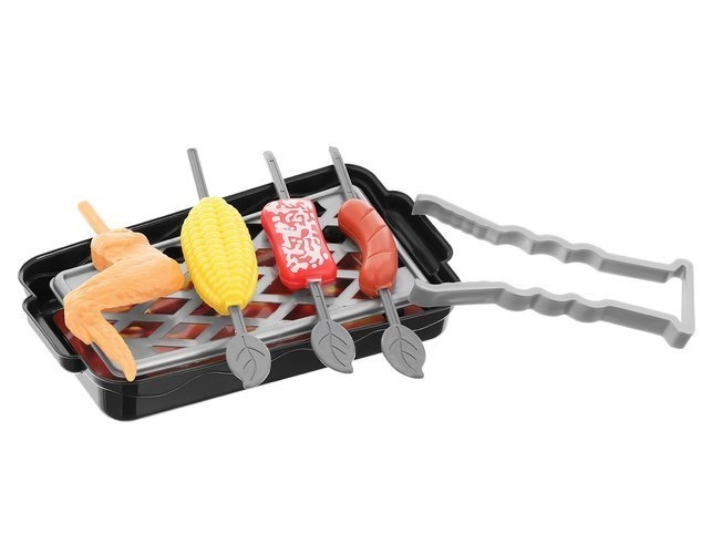În pachet găsiți, printre altele, grătar cu grătar metalic, aragaz cu inducție, oală sub presiune și oală, tigaie, ceainic, tocător și cuțite sigure, ustensile (polonice, spatule, clești), veselă (boluri, farfurii, căni) și „alimente” și condimente pentru un joc realist.