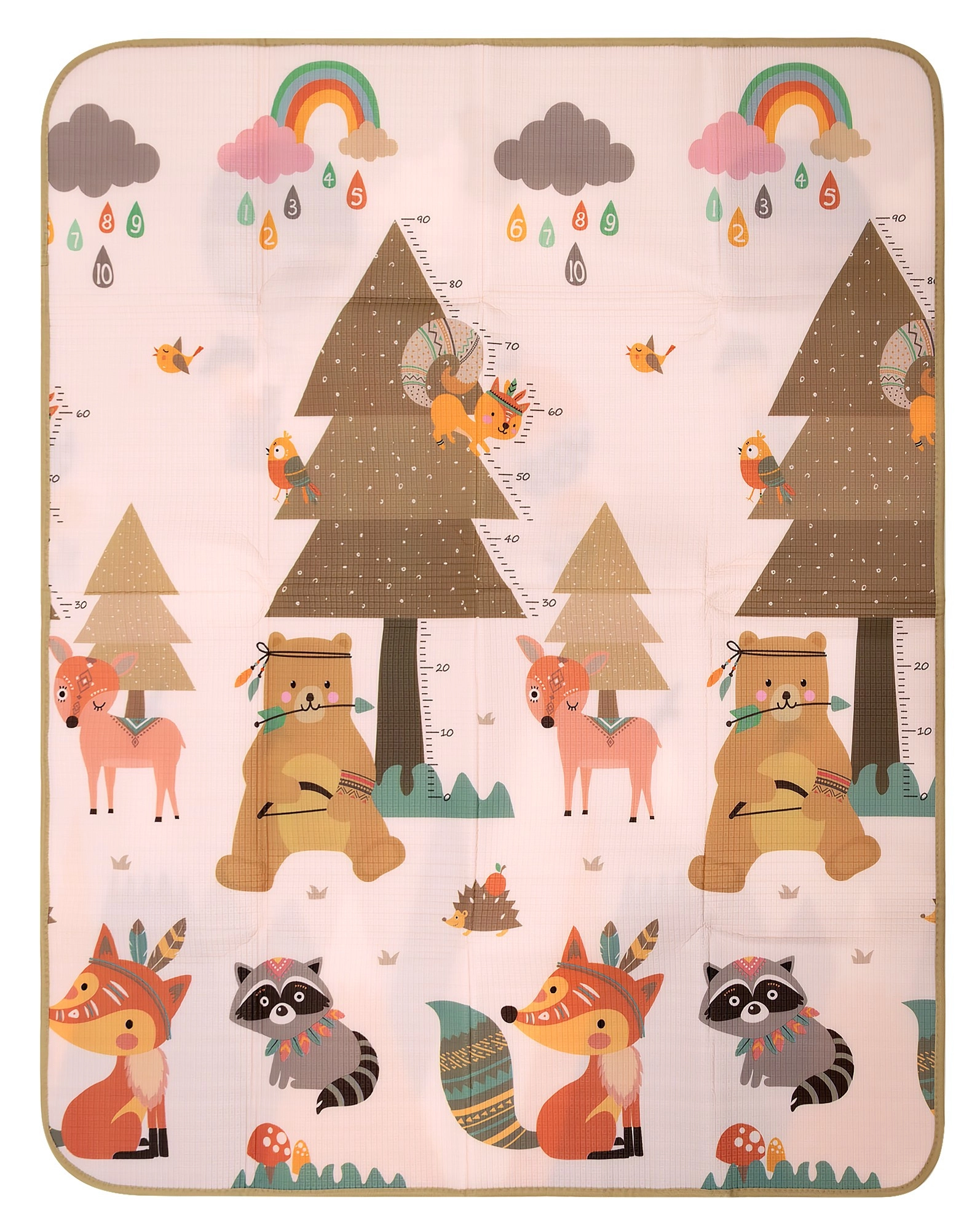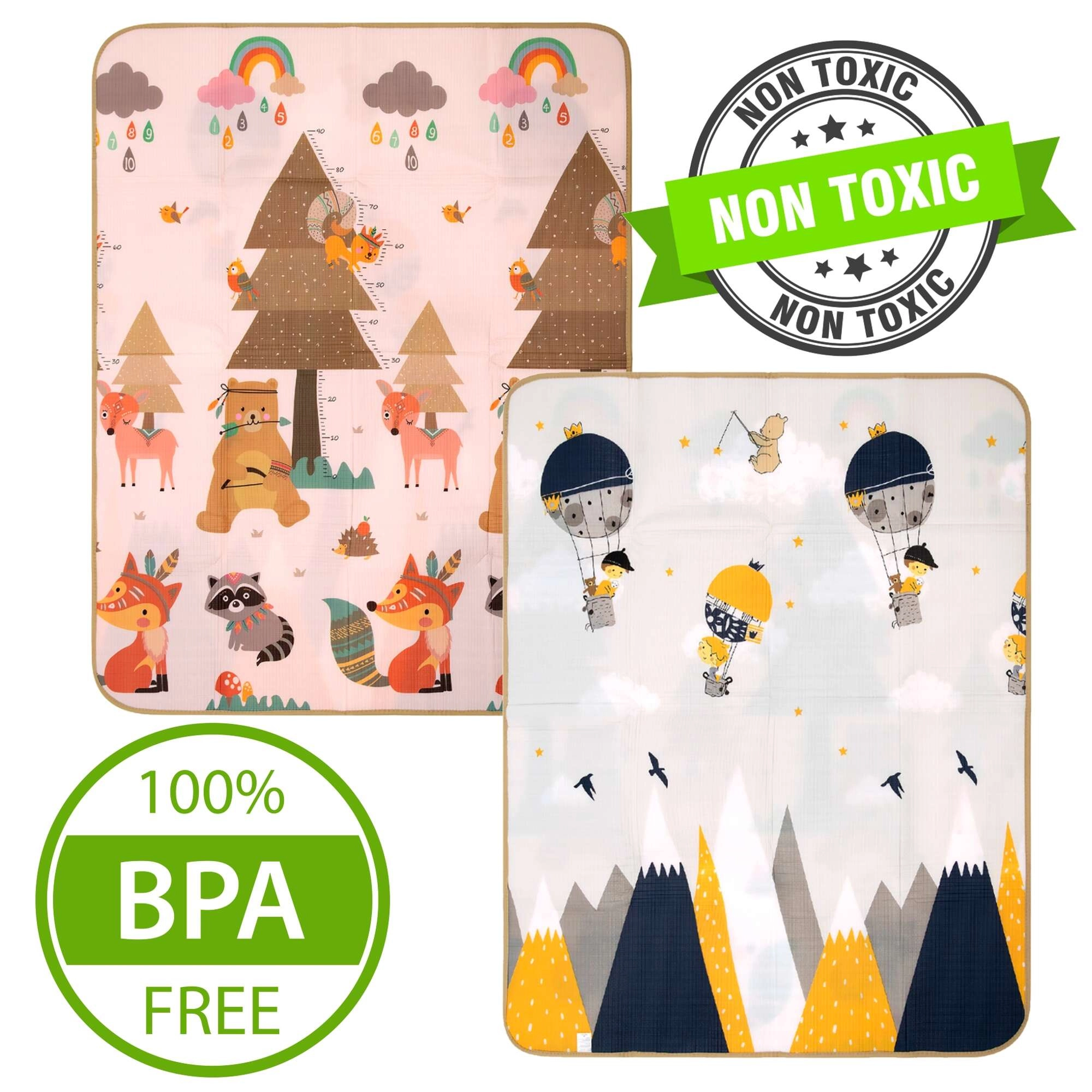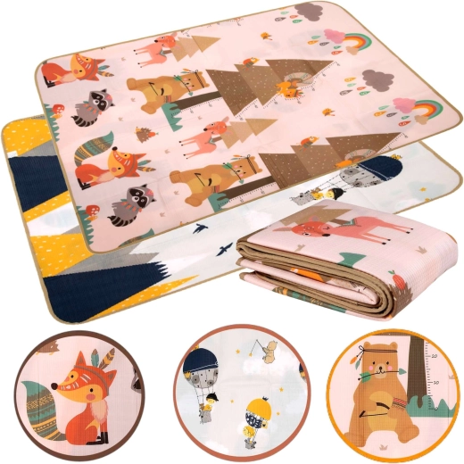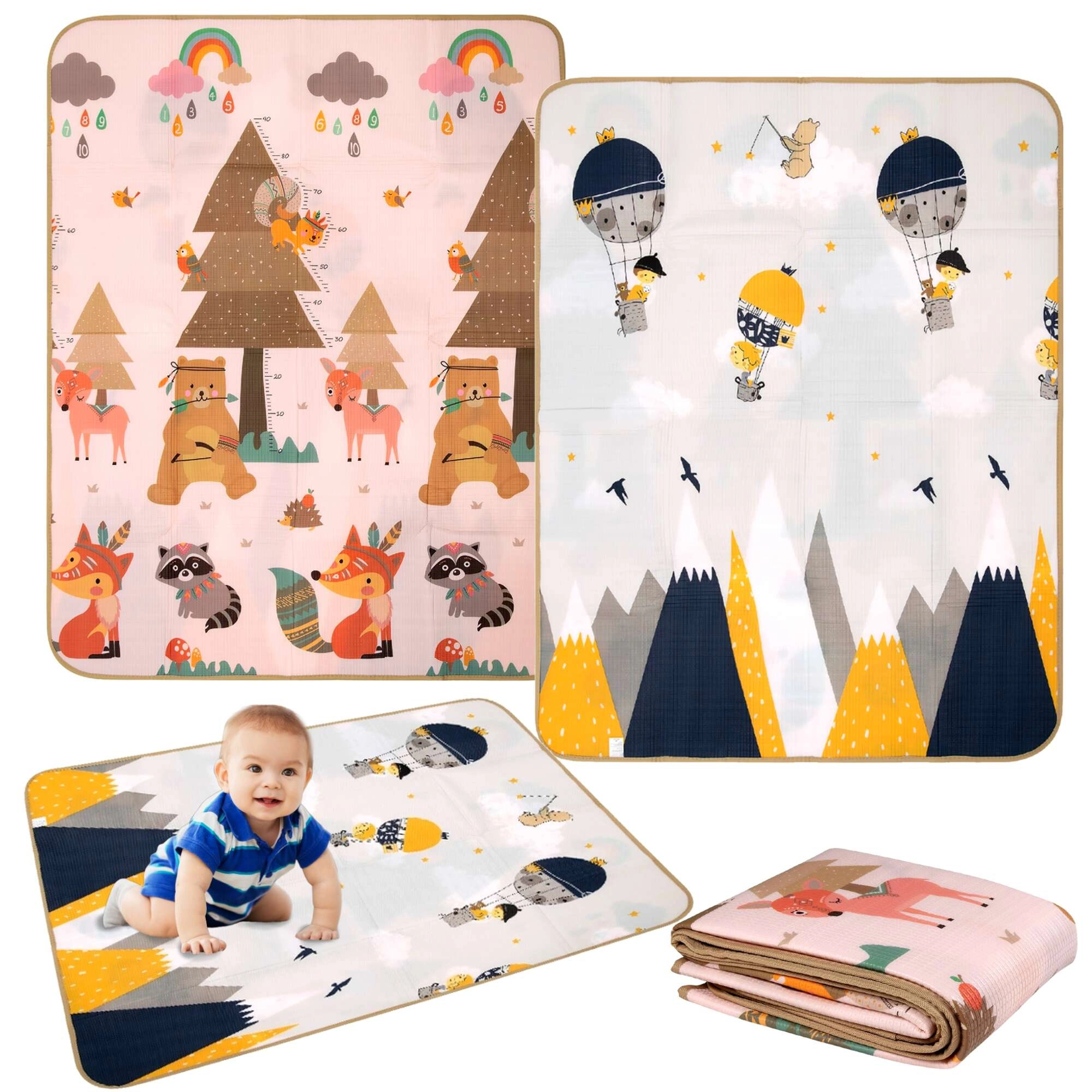 - Design dublu-față 2 în 1 – animăluțe, munți, baloane și riglă de creștere