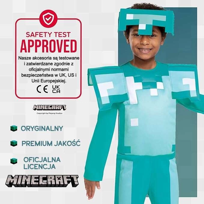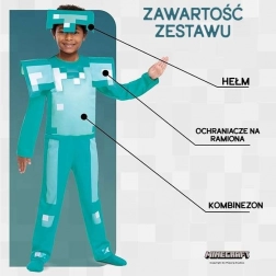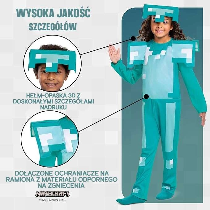 Acest costum MINECRAFT cu armură de diamant, licențiat oficial, îi transformă pe copii în eroii jocului lor preferat. Combinezonul moale cu imprimeu pixelat și panourile proeminente pentru umeri sunt completate de o cască ușoară, care oferă costumului aspectul iconic. Datorită materialelor plăcute, costumul este confortabil chiar și la purtare îndelungată.