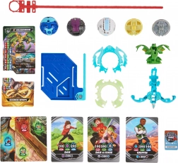 În pachet găsești bile Bakugan, piese pentru Special Attack, cărți de luptători și abilități, cărți Gate și un suport de depozitare – totul pentru a începe jocul.