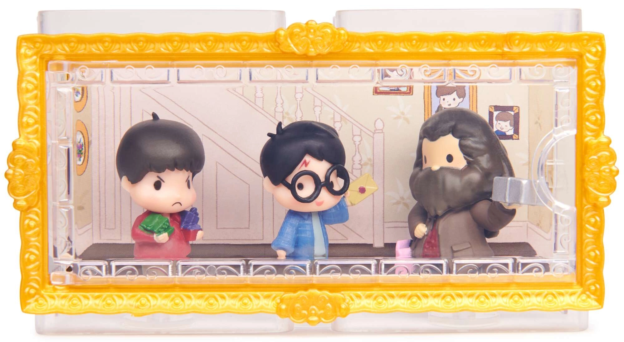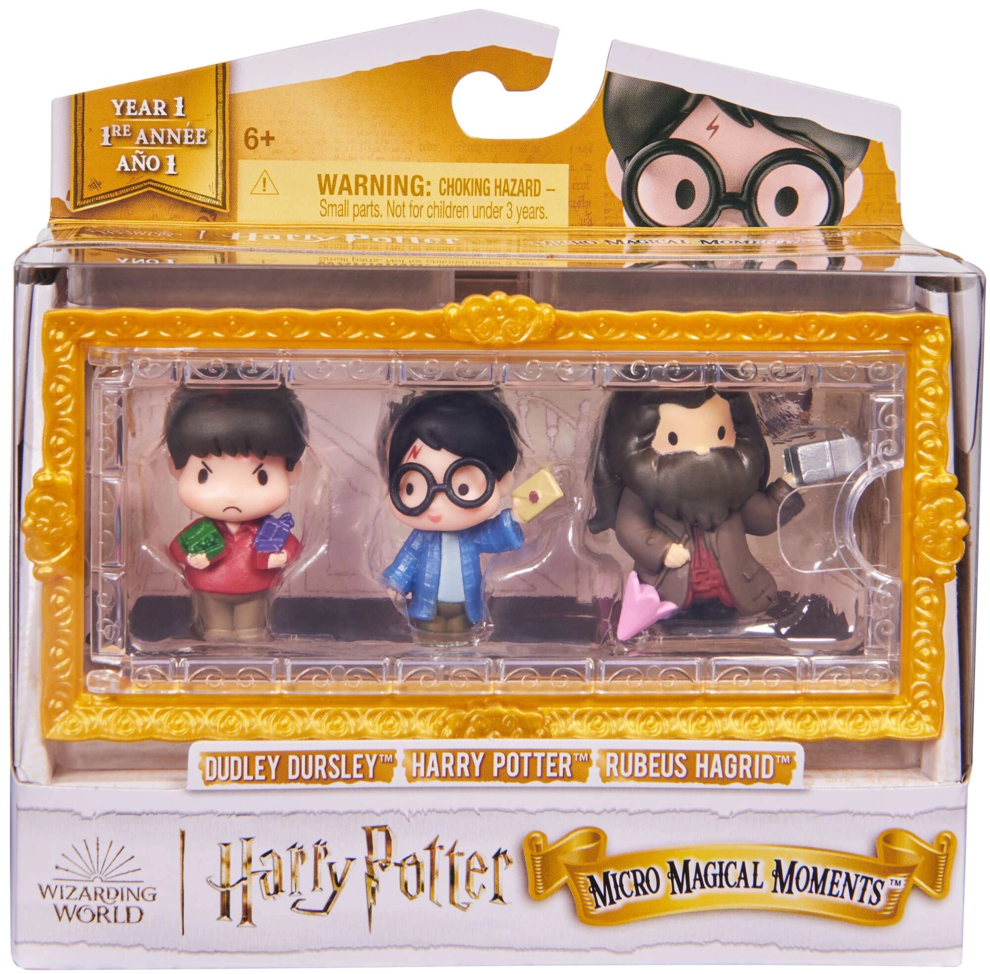 Descoperă magia seriei Micro Magical Moments și creează-ți propria dioramă mini din Hogwarts. Figurinele Harry Potter, Rubeus Hagrid și Dudley Dursley sunt așezate într-o carcasă practică cu fereastră transparentă, care le protejează și le expune cu stil. Fiecare personaj are accesorii iconice – Hagrid o cutie și o umbrelă, Harry o scrisoare, iar Dudley jucăriile sale.