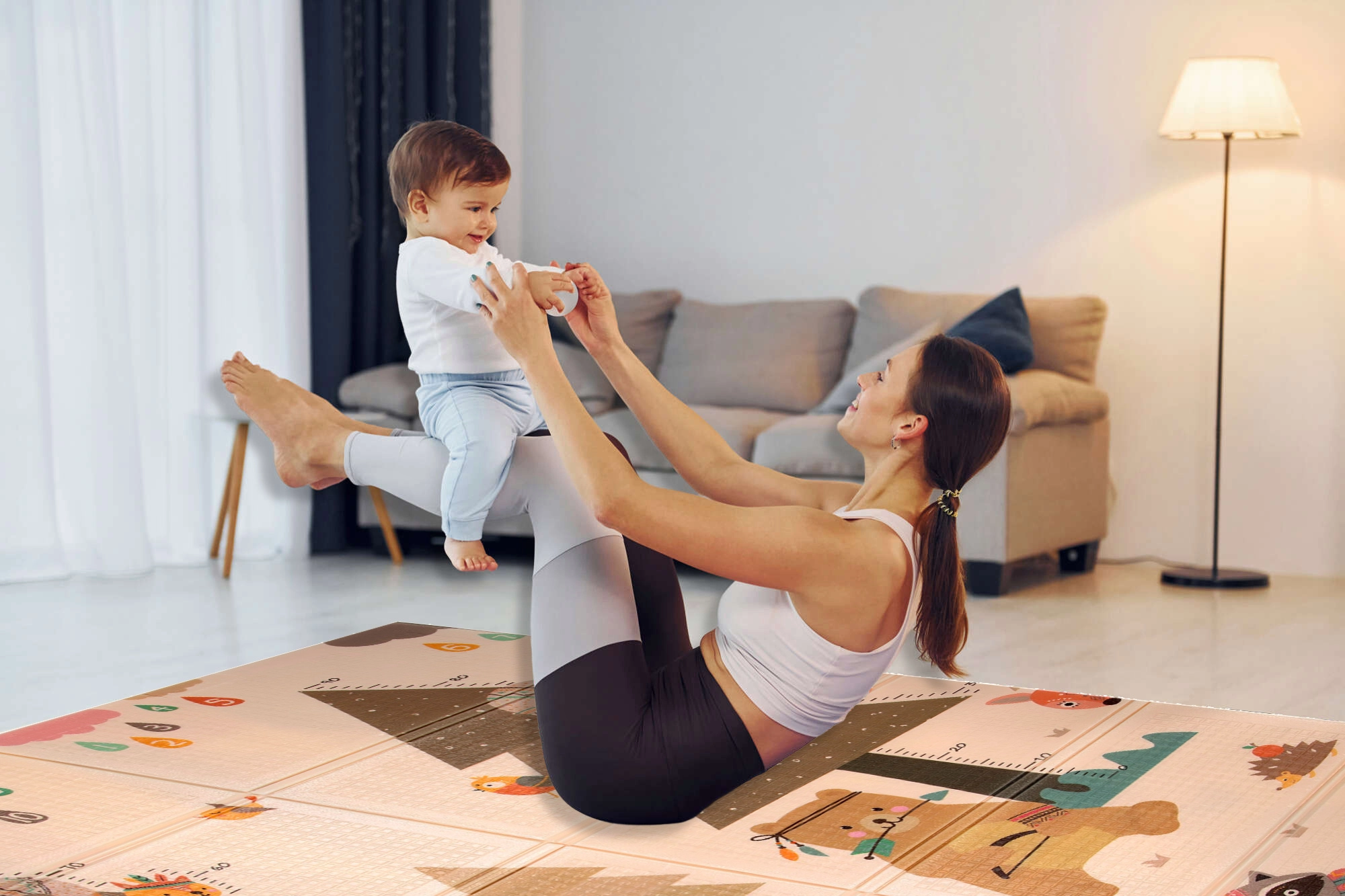 Două fețe cu motive vesele stimulează dezvoltarea senzorială și joaca. Suprafața ușor reliefată, antiderapantă, susține târâtul în siguranță și primii pași.