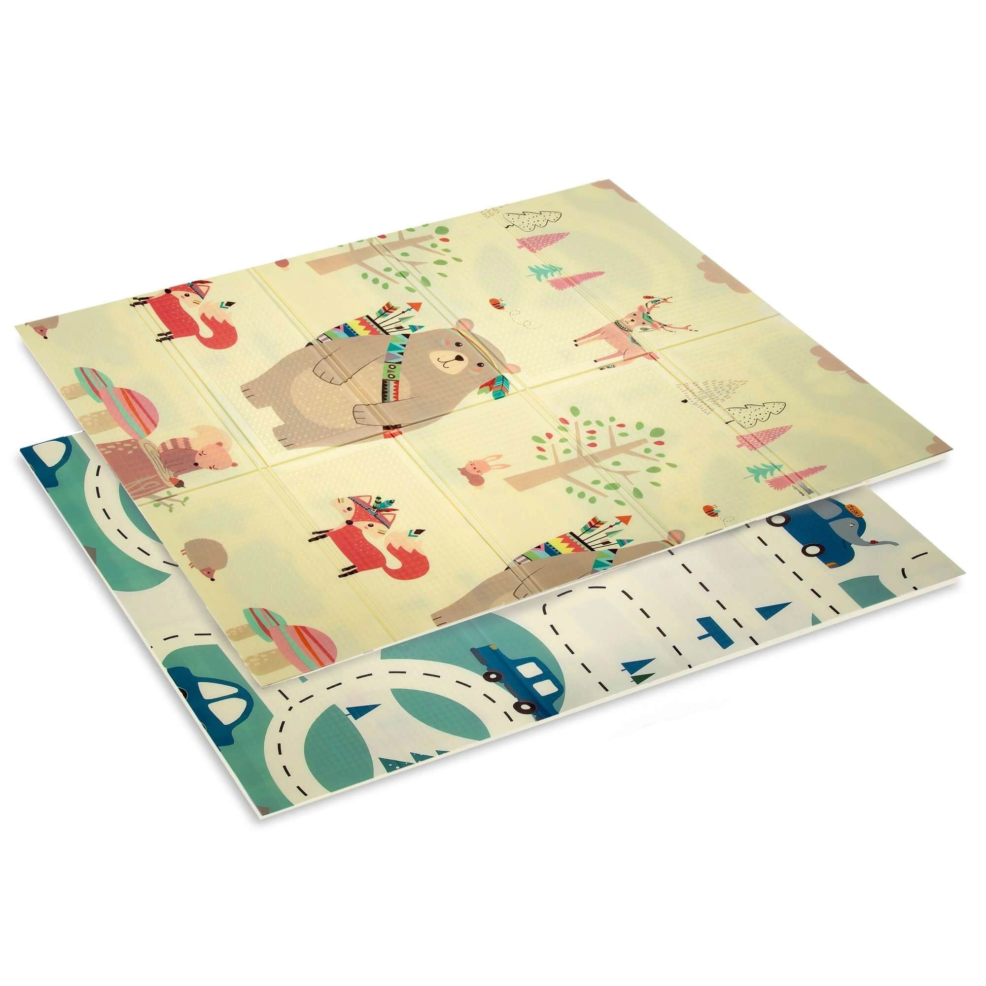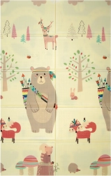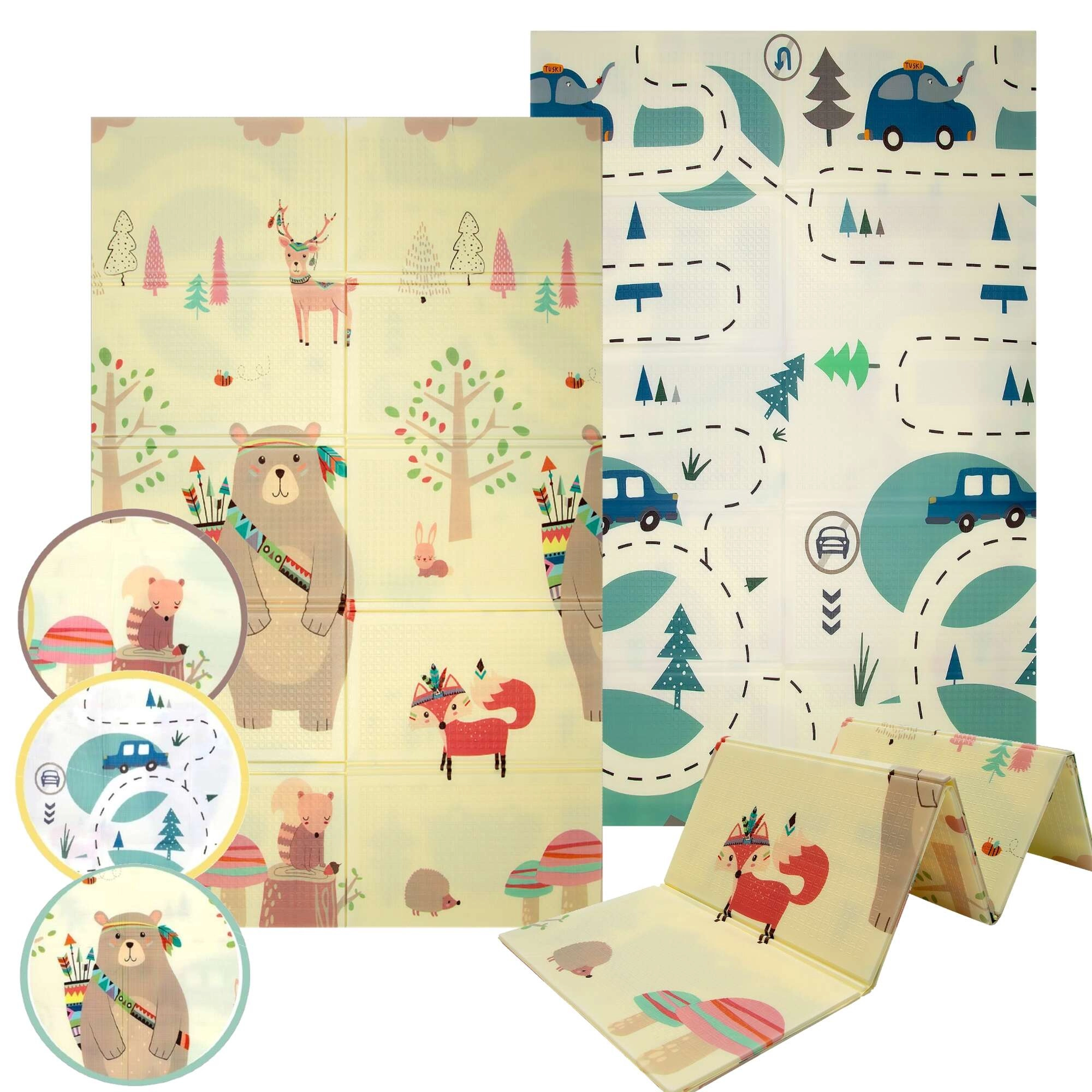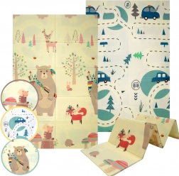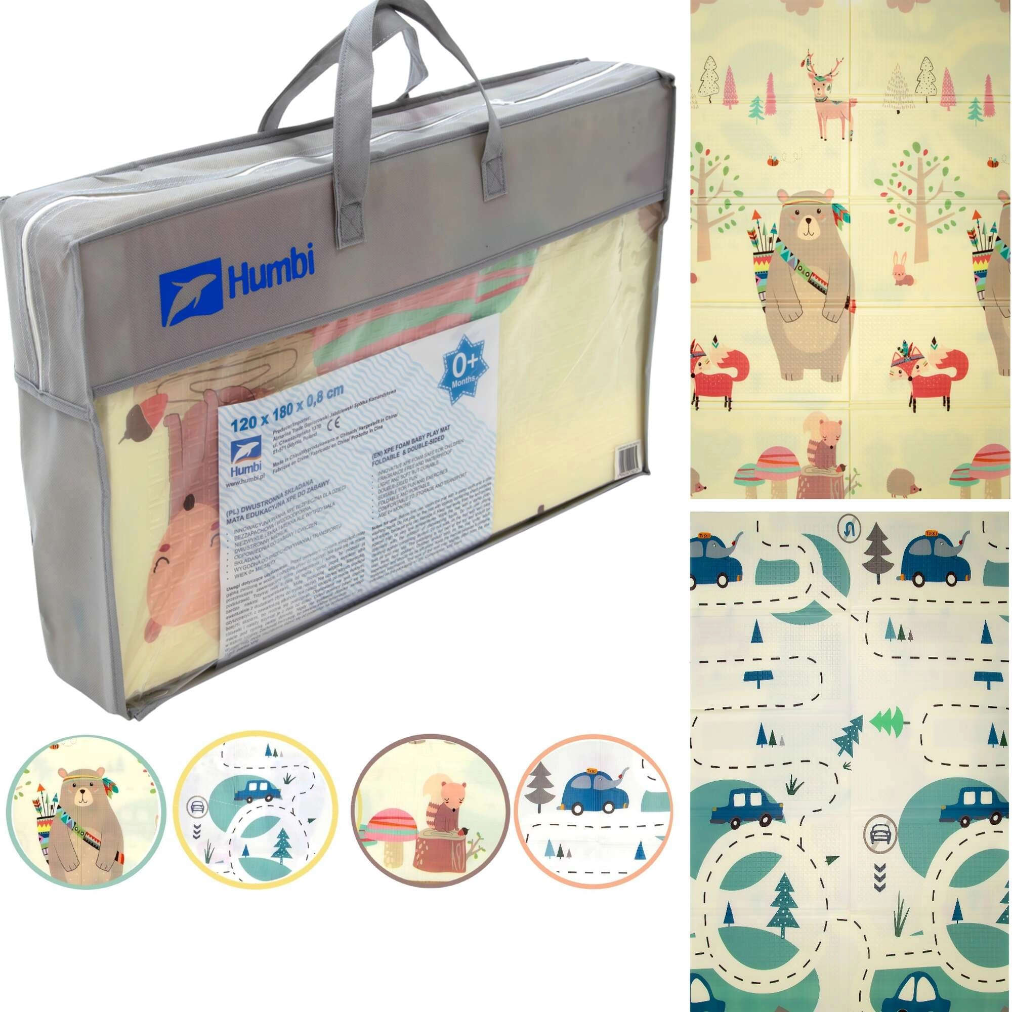 Covorașul HUMBI oferă copiilor un loc moale și sigur pentru joacă, odihnă și dezvoltarea motricității. Spuma XPE de calitate este fermă, absoarbe șocurile și în același timp izolează foarte bine de frigul podelei. Designul cu două fețe oferă pe o parte adorabile motive din pădure (urși, vulpi, arici), iar pe cealaltă parte o șosea cu mașinuțe pentru joacă distractivă și explorare senzorială.