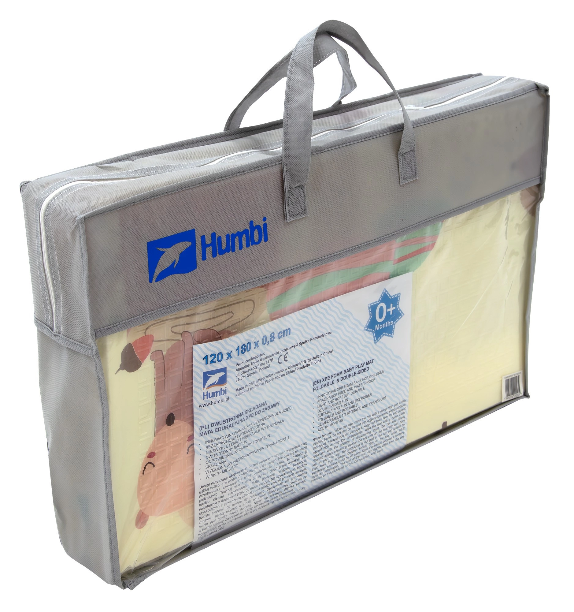Covorașul pentru copii HUMBI, practic și confortabil, din spumă XPE de calitate, oferă dimensiunea de 120 × 180 cm și grosimea de 0,8 cm pentru joacă, târâre și primii pași în siguranță. Este cu două fețe, pliabil, ușor și datorită suprafeței rezistente la apă se întreține ușor curat. Nu conține BPA, ftalați, PVC sau formamidă, respectă standardele EN71 și REACH și este ideal atât în interior, cât și în exterior.