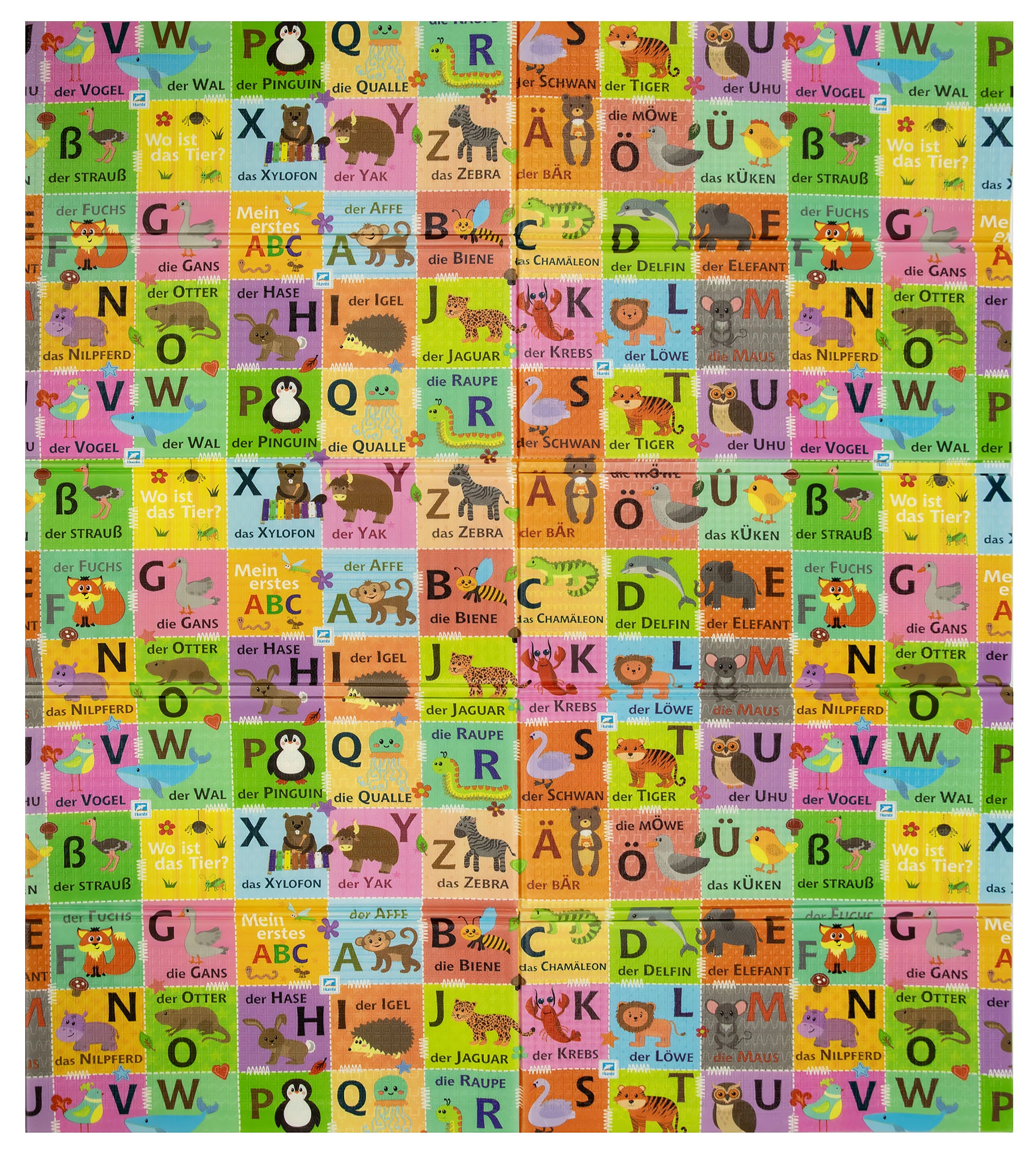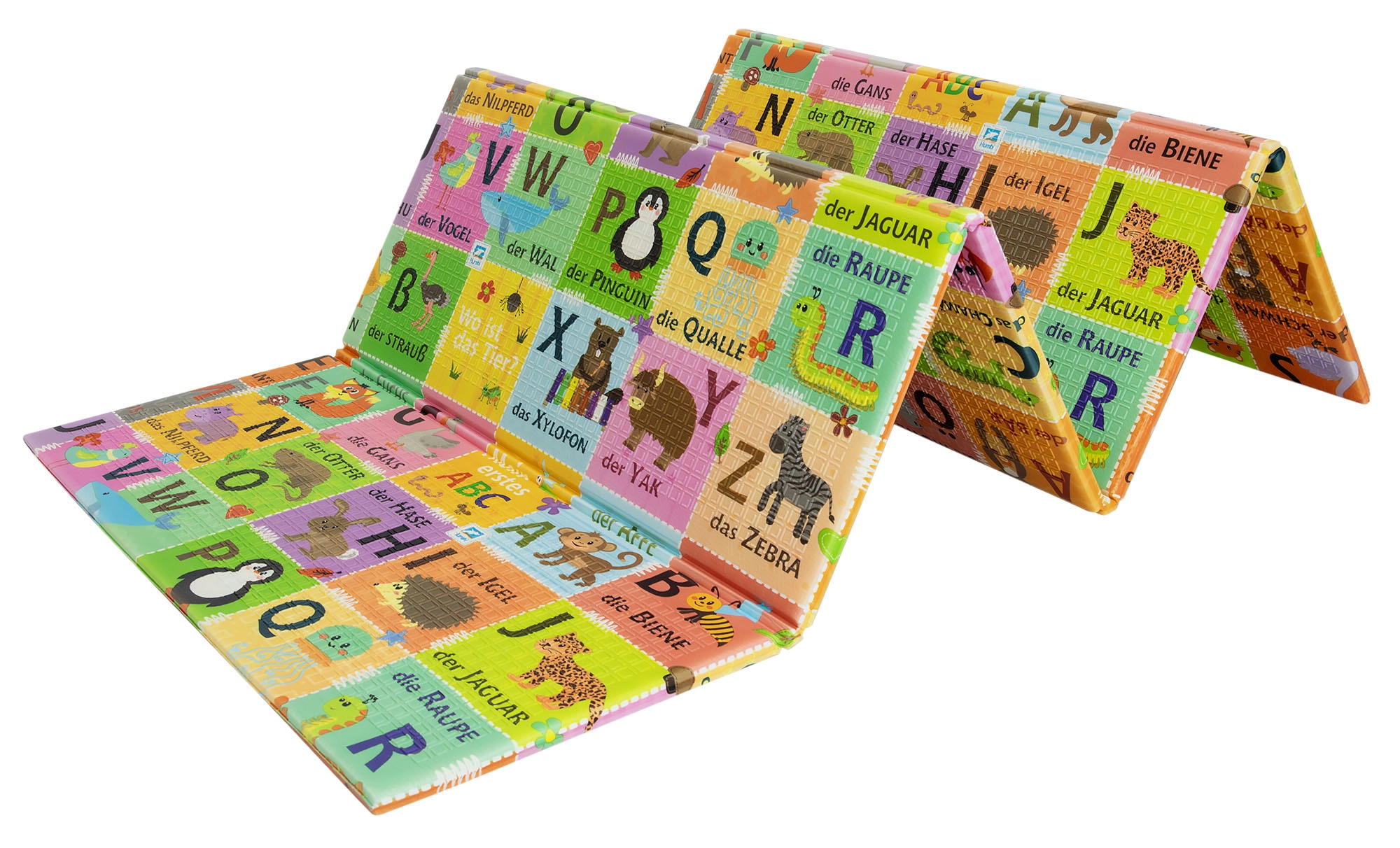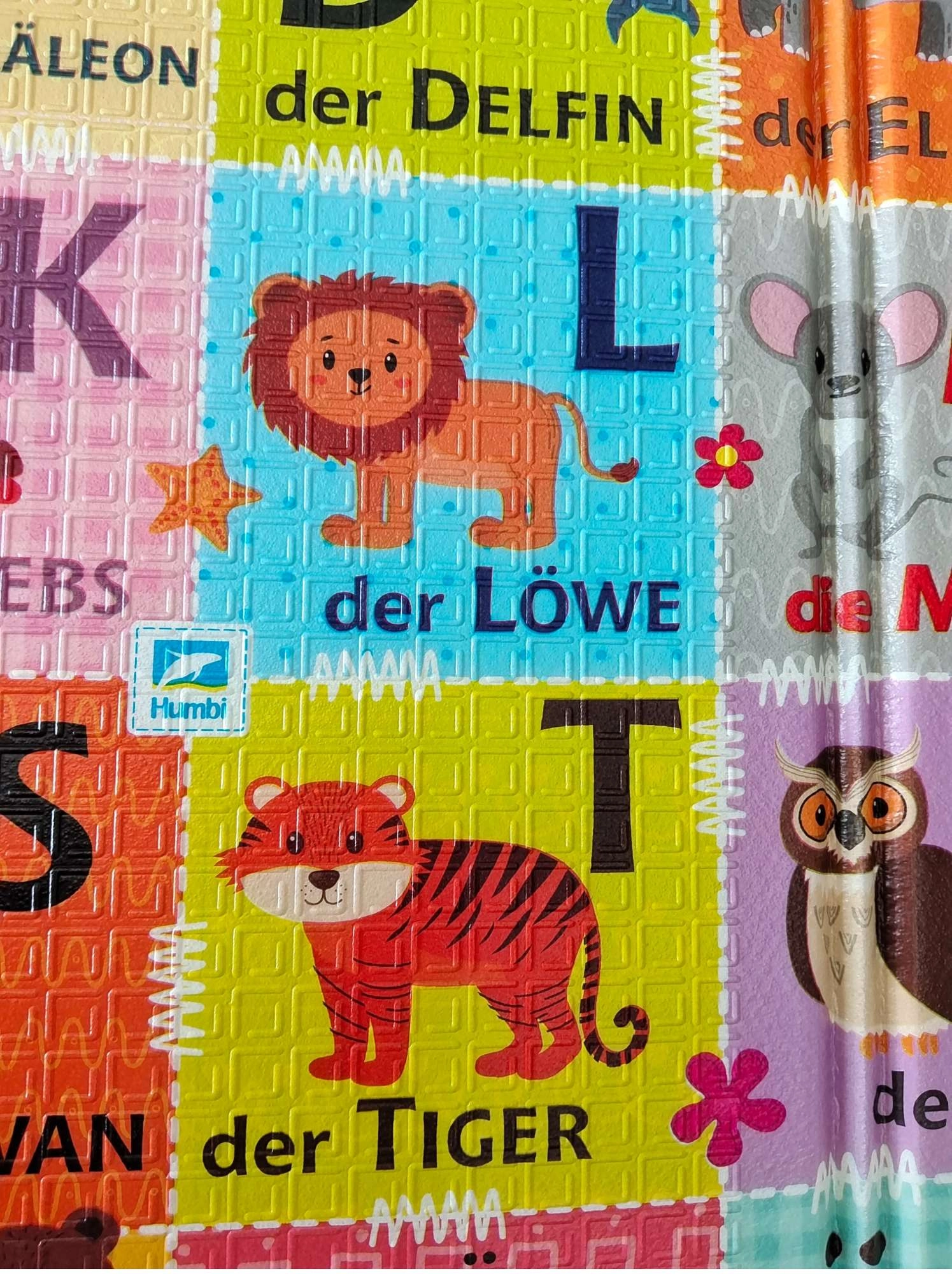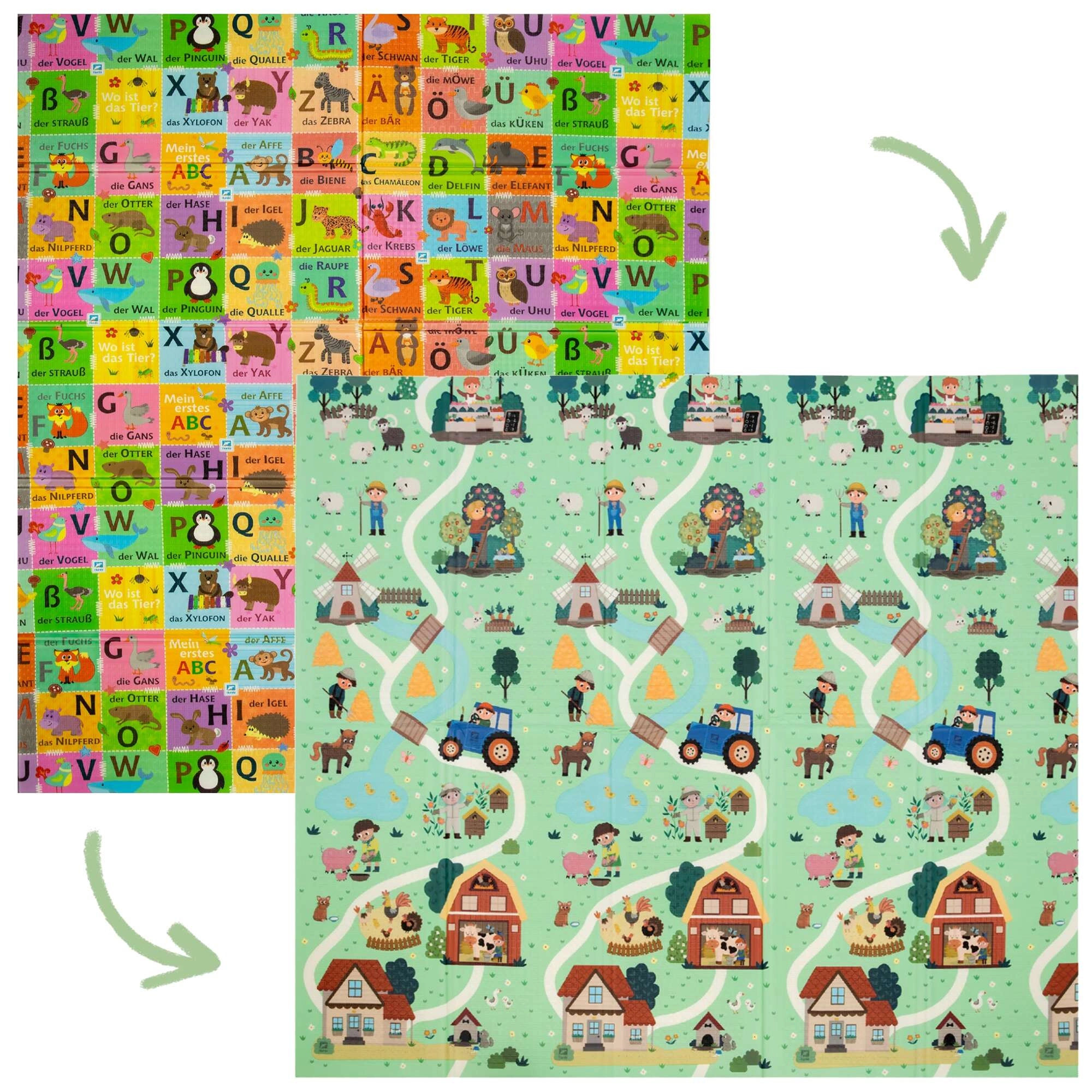 Ambele fețe cu grafică educativă susțin învățarea timpurie: una prezintă alfabetul german cu animăluțe, cealaltă o scenă din viața la țară. Datorită suprafeței antiderapante, fin reliefate, este sigură pentru târâre și mers și, în același timp, stimulează dezvoltarea senzorială.