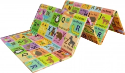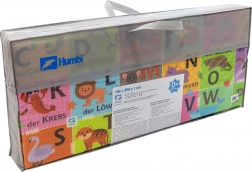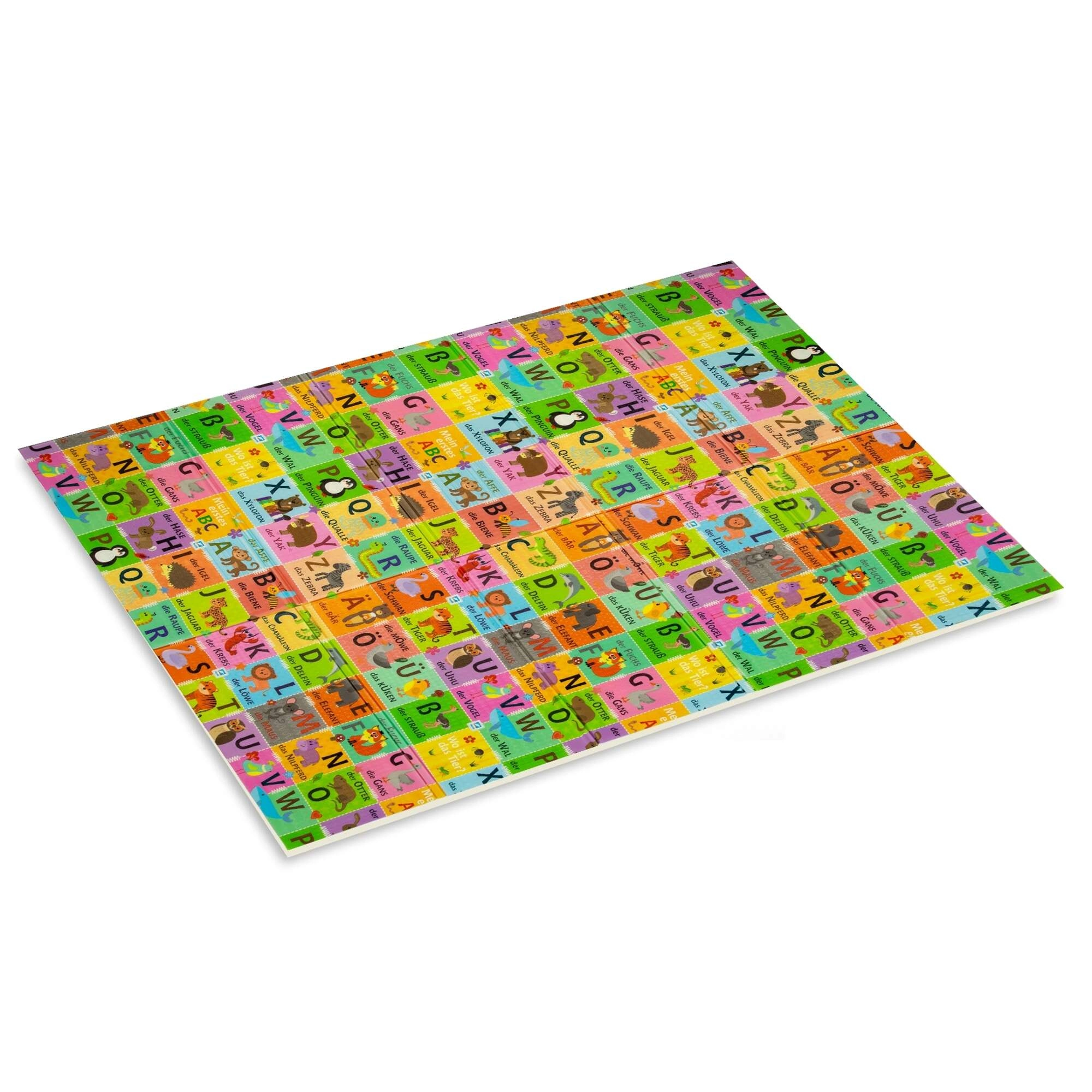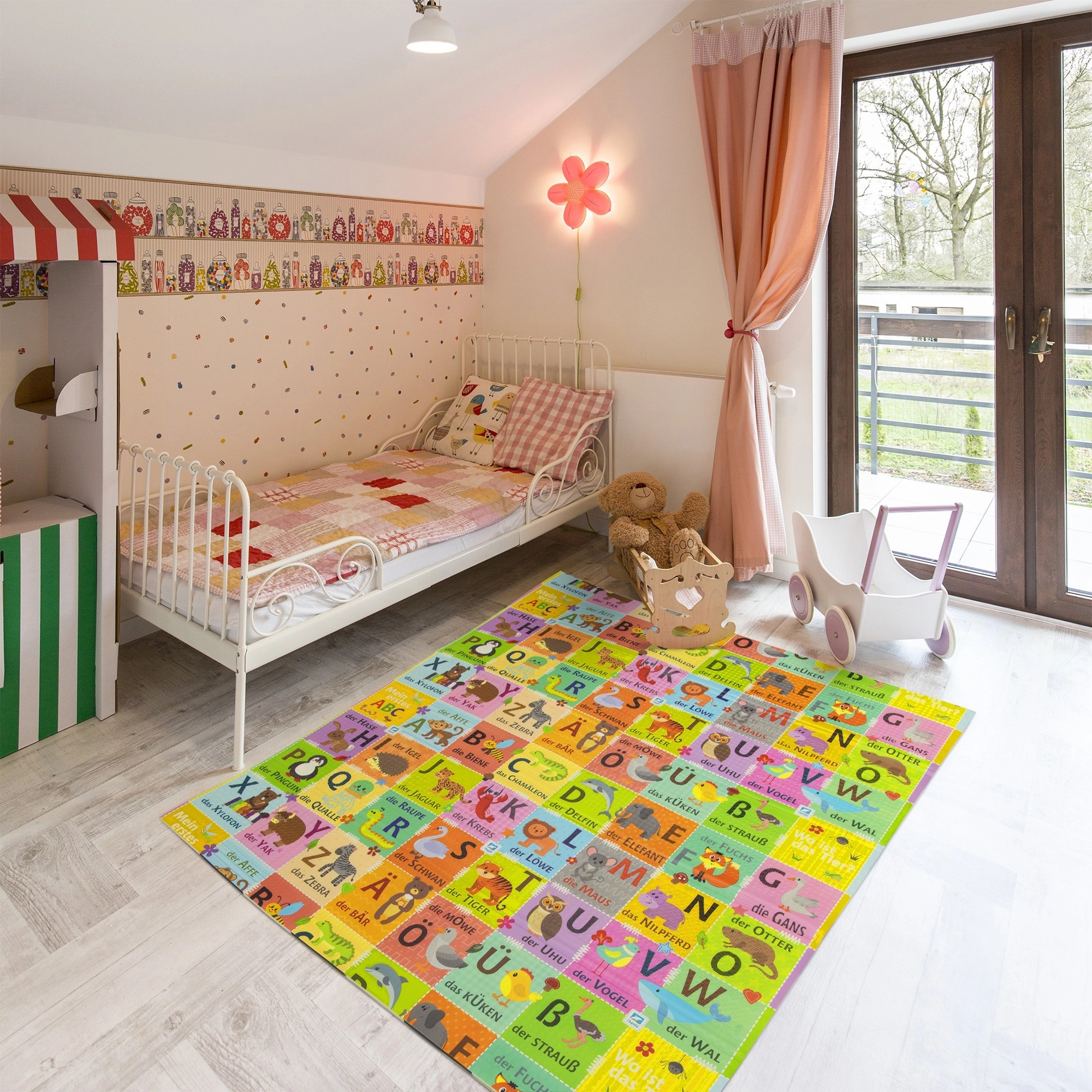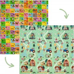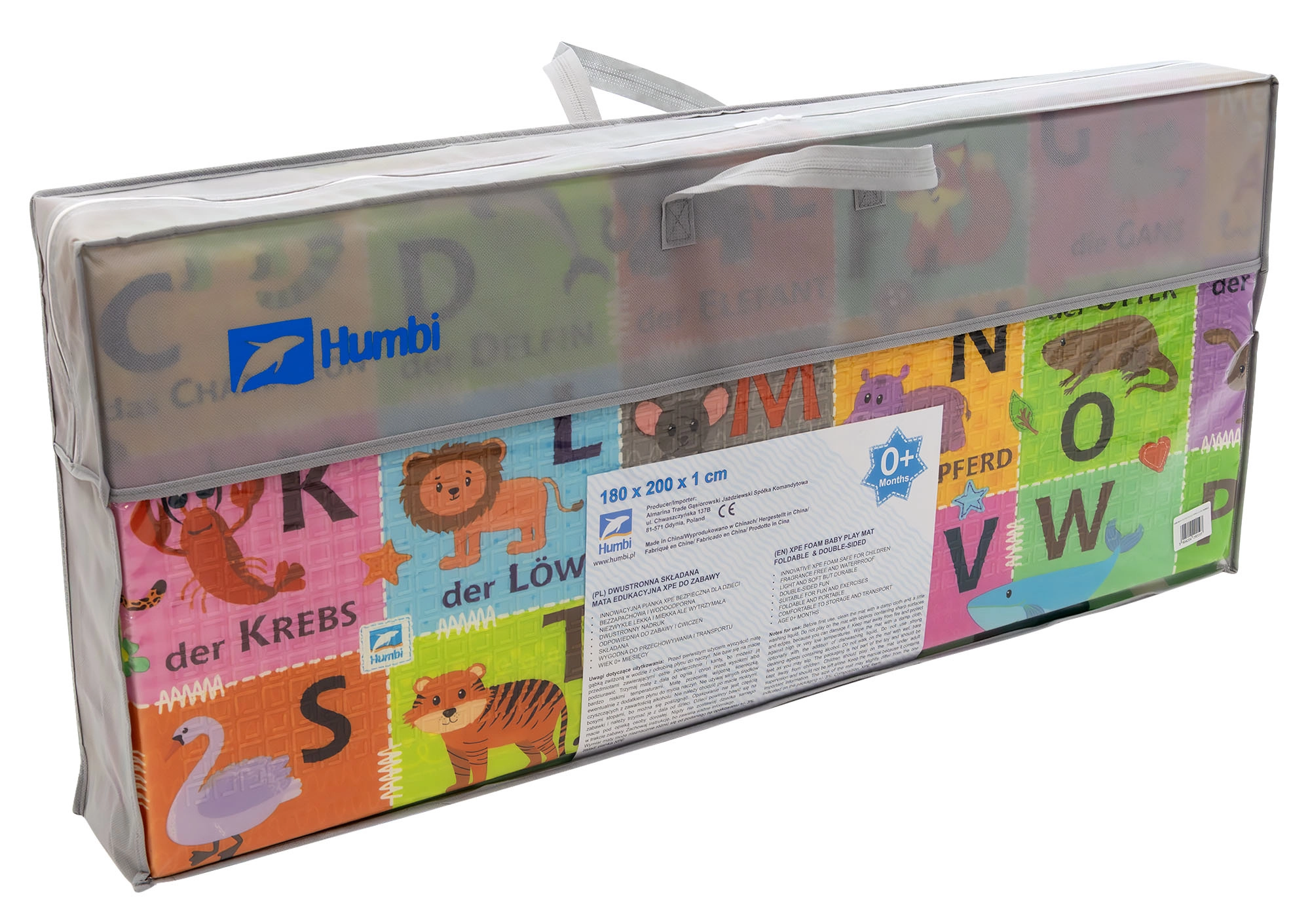 Ambele fețe cu grafică educativă susțin învățarea timpurie: una prezintă alfabetul german cu animăluțe, cealaltă o scenă din viața la țară. Datorită suprafeței antiderapante, fin reliefate, este sigură pentru târâre și mers și, în același timp, stimulează dezvoltarea senzorială.