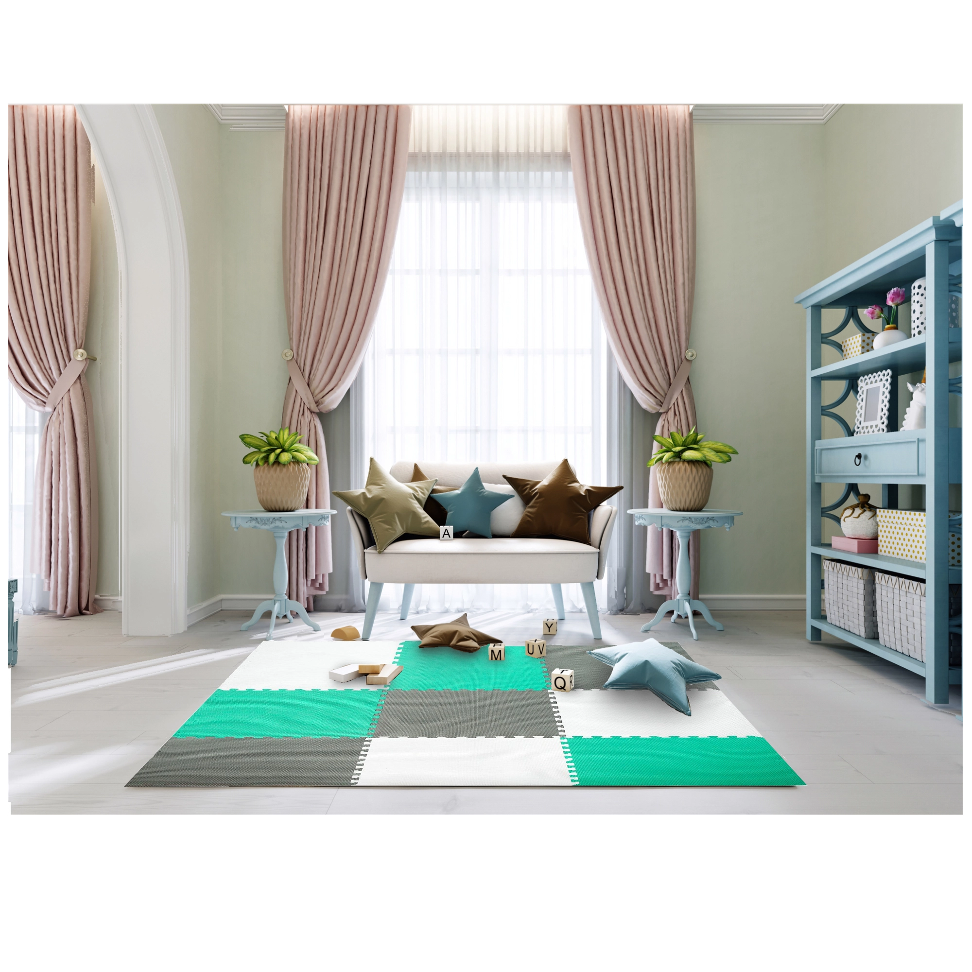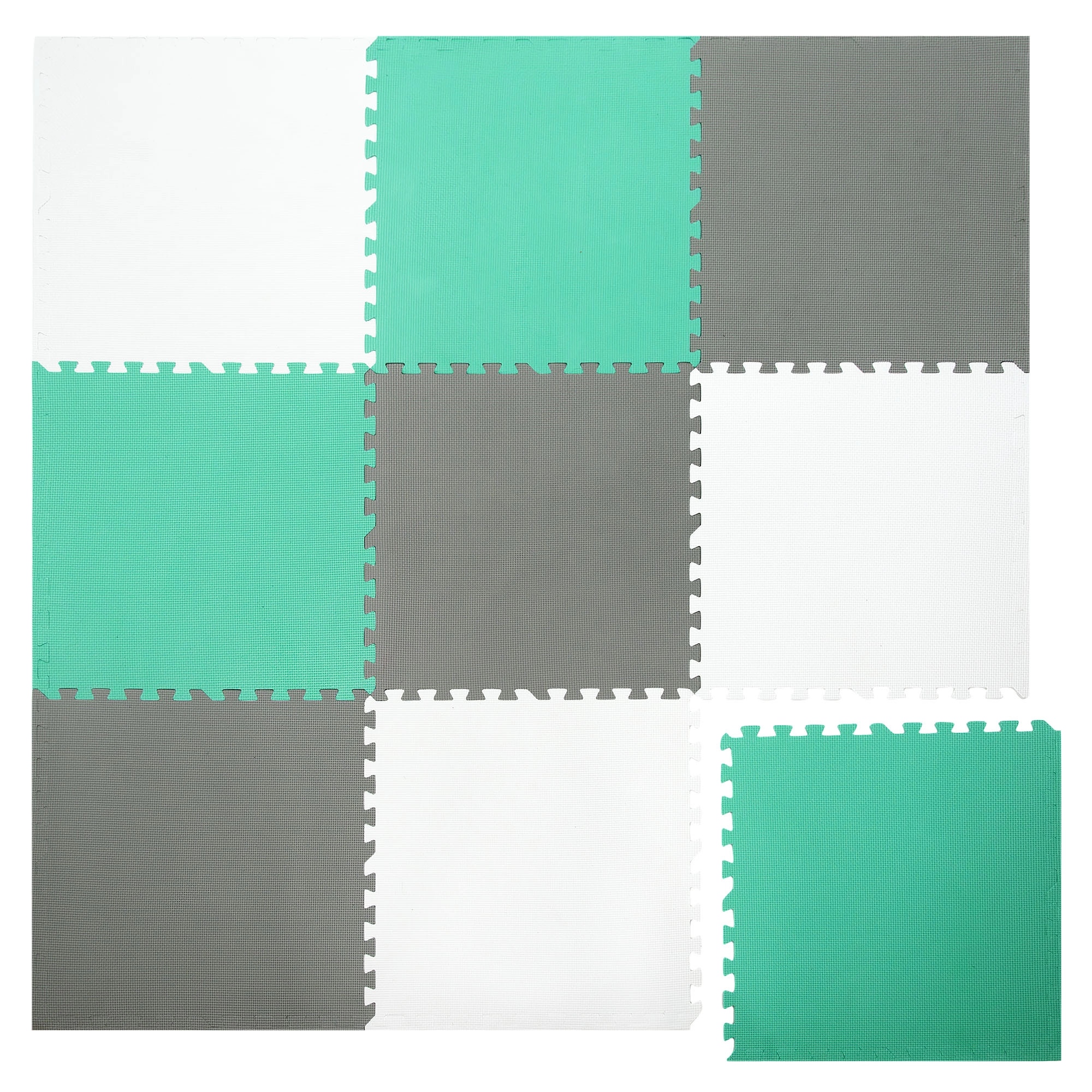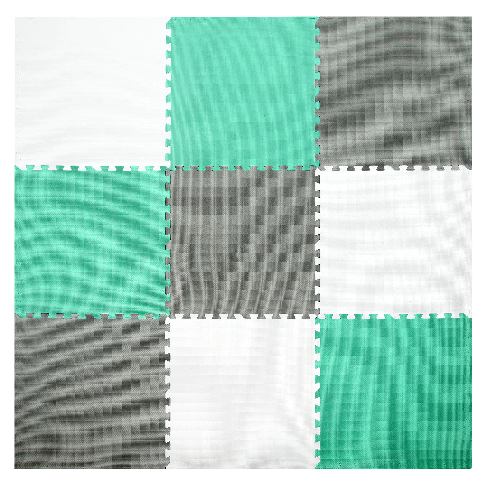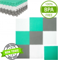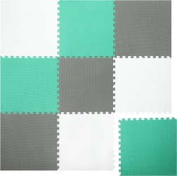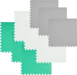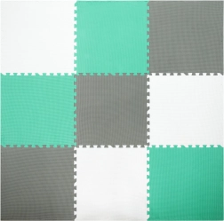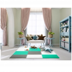 Cele 9 piese mari de 60 × 60 cm (inclusiv 18 margini) se îmbină ușor într-o suprafață de 180 × 180 cm sau se pot combina cu un alt set al aceluiași model pentru a crea o zonă de joacă mai mare. Materialul este impermeabil și ușor de curățat – este suficient să ștergeți cu o cârpă umedă. Culorile neutre mentă, gri și alb se potrivesc oricărui interior și nu distrag atenția copiilor.