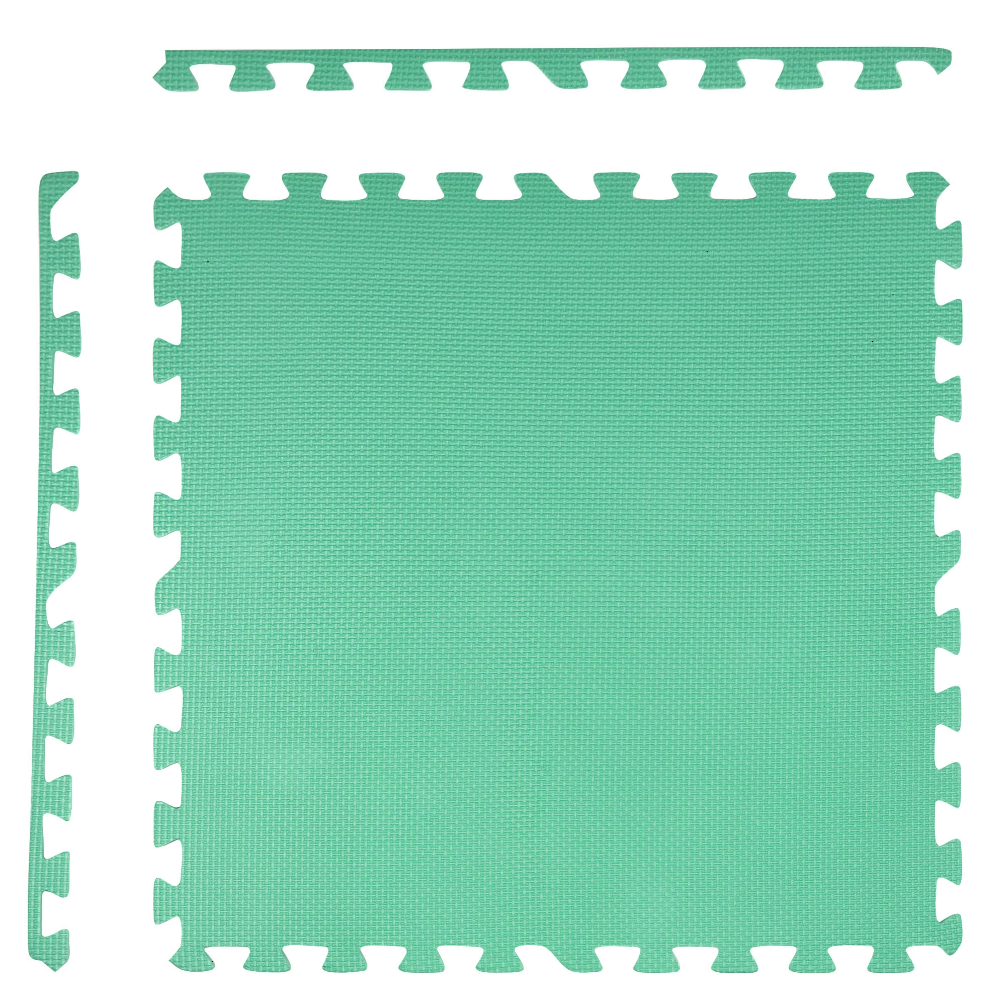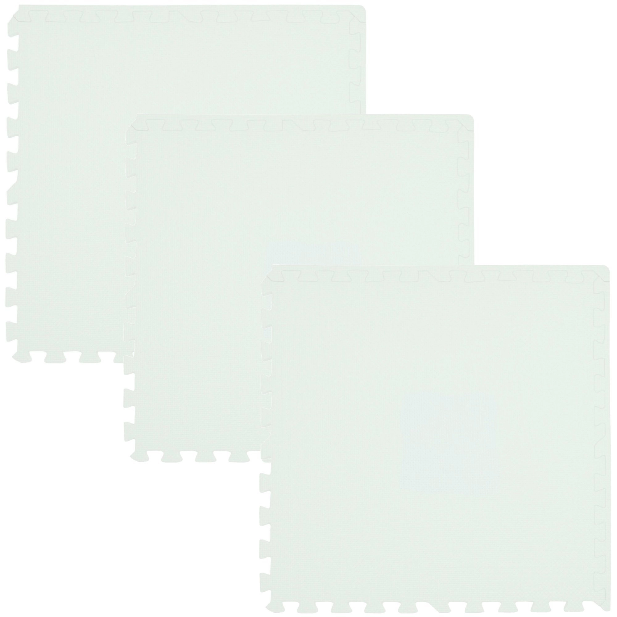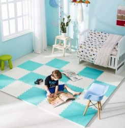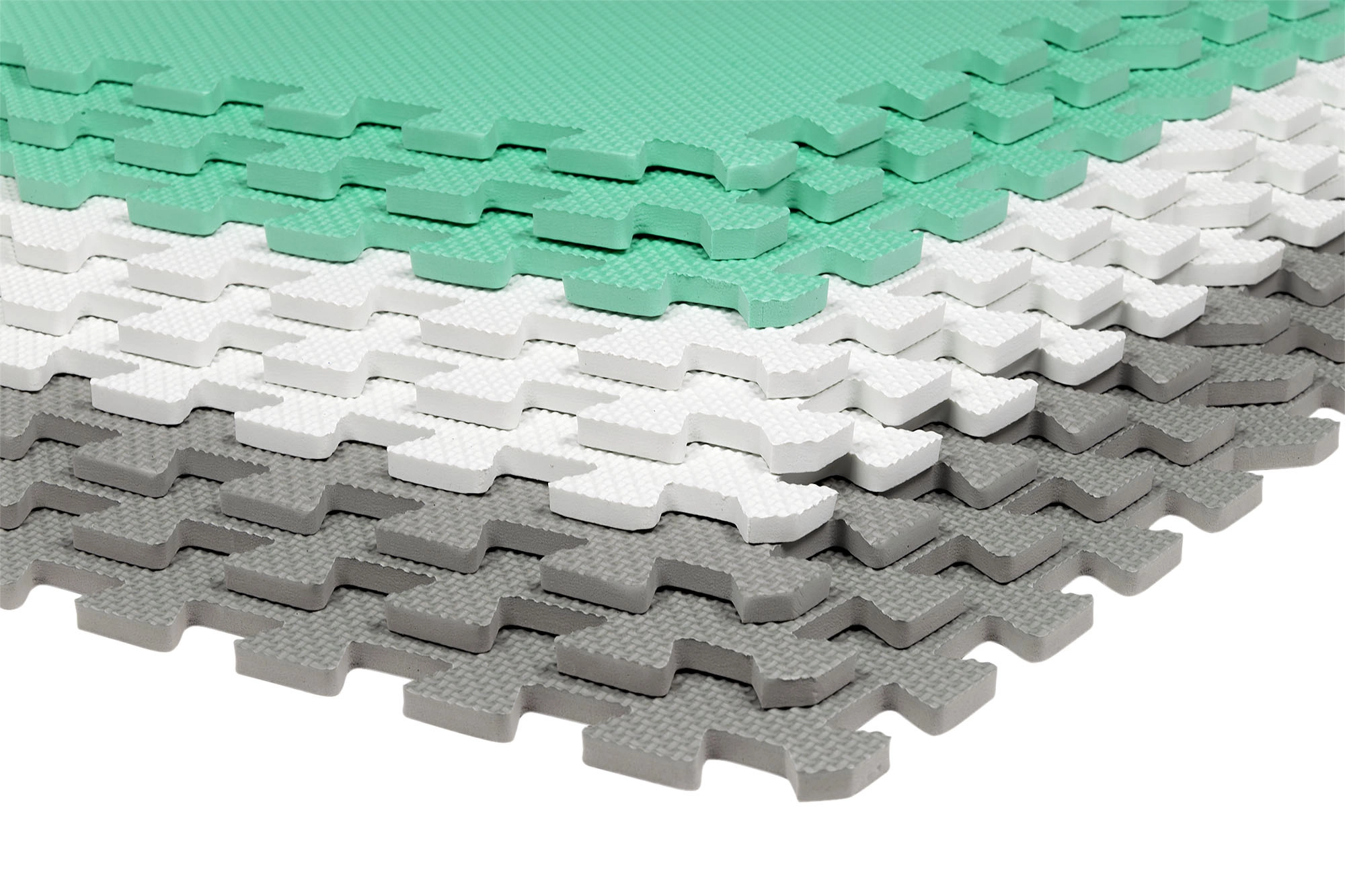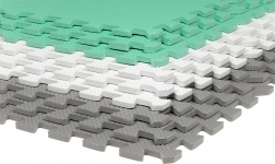 Cele 9 piese mari de 60 × 60 cm (inclusiv 18 margini) se îmbină ușor într-o suprafață de 180 × 180 cm sau se pot combina cu un alt set al aceluiași model pentru a crea o zonă de joacă mai mare. Materialul este impermeabil și ușor de curățat – este suficient să ștergeți cu o cârpă umedă. Culorile neutre mentă, gri și alb se potrivesc oricărui interior și nu distrag atenția copiilor.