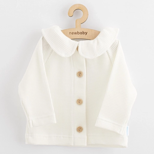 Jacheta-cardigan elegantă pentru copii New Baby Laura este ideală atât pentru purtare zilnică, cât și pentru momente festive. Are închidere practică cu nasturi, guler frumos și nasturi din lemn stilizați, care oferă un aspect elegant. Fabricată din 100% bumbac pentru finețe, respirabilitate și confort pe tot parcursul anului.