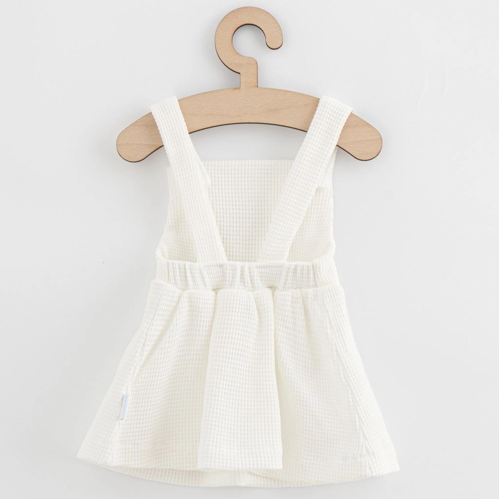 Rochiță cu bretele pentru copii NEW BABY Laura, drăguță și stilată, în culoare albă, din bumbac 100%. Rochia are o textură interesantă a materialului, aplicație cu ursuleț și închidere practică cu nasturi. Ideală pentru purtare zilnică și ocazii festive datorită tricotului moale și respirabil.