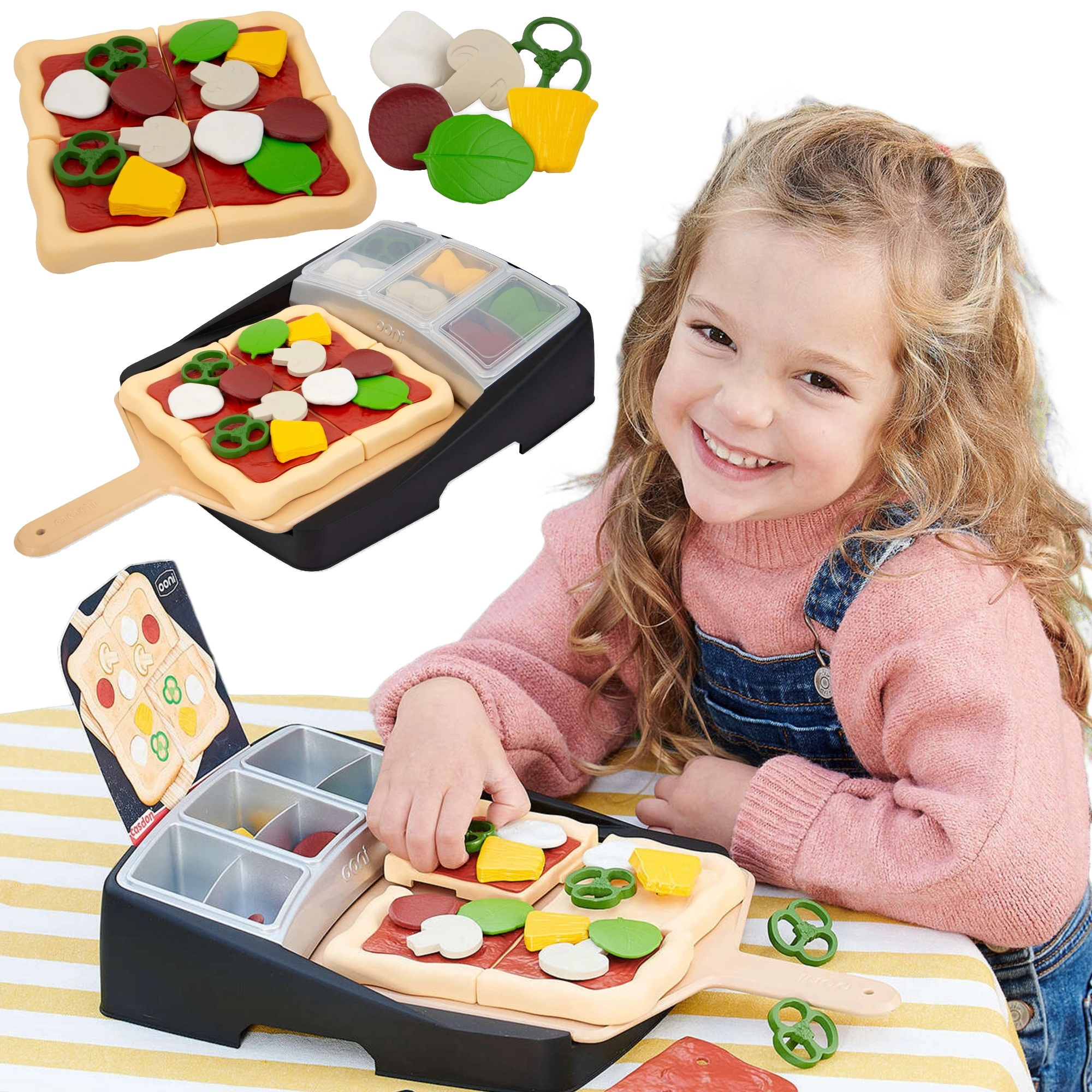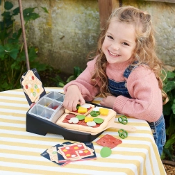 Această modernă stație de pizza pentru copii aduce o pregătire realistă a pizzei pas cu pas. Datorită compartimentelor clare pentru ingrediente, copiii aleg ușor ce se potrivește pe pizza și, după rețetele incluse sau propria fantezie, compun combinația perfectă. Piesele detașabile se fixează ușor pe blat și se scot la fel de simplu, astfel încât se poate reda la nesfârșit.